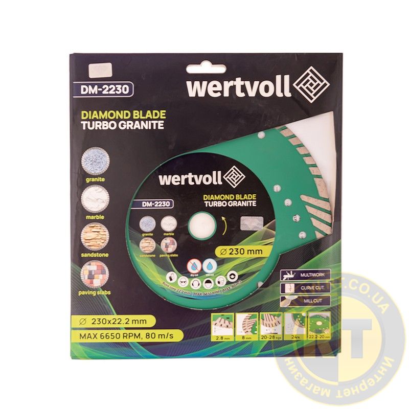 алмазный диск по граниту, диск по камню, turbo granite 230, диск 230 мм, WERTVOLL, диск для тротуарной плитки, диск для камнереза, диск для болгарки, алмазный слой 8 мм, DM-2230Алмазный диск TURBO GRANITE 230×3 мм, h=8 мм, >24%, адаптер 22,2–20 мм, 6650 об/мин WERTVOLL (DM-2230)