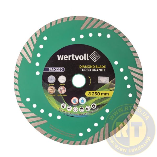 Алмазный диск TURBO GRANITE 230×3 мм, h=8 мм, >24%, адаптер 22,2–20 мм, 6650 об/мин WERTVOLL (DM-2230)