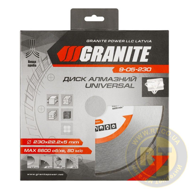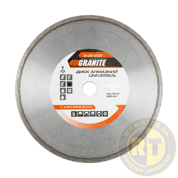 алмазный диск, универсальный диск, диск 230 мм, диск по бетону, диск по кирпичу, диск по плитке, GRANITE, диск для болгарки, UNIVERSAL, 9-05-230Алмазный диск UNIVERSAL 230×2,6 мм 22–24% 6600 об/мин GRANITE