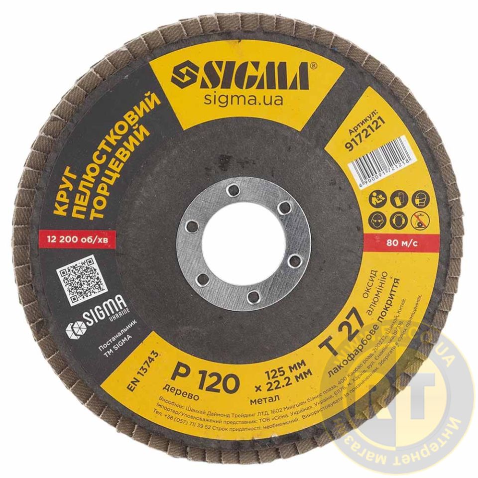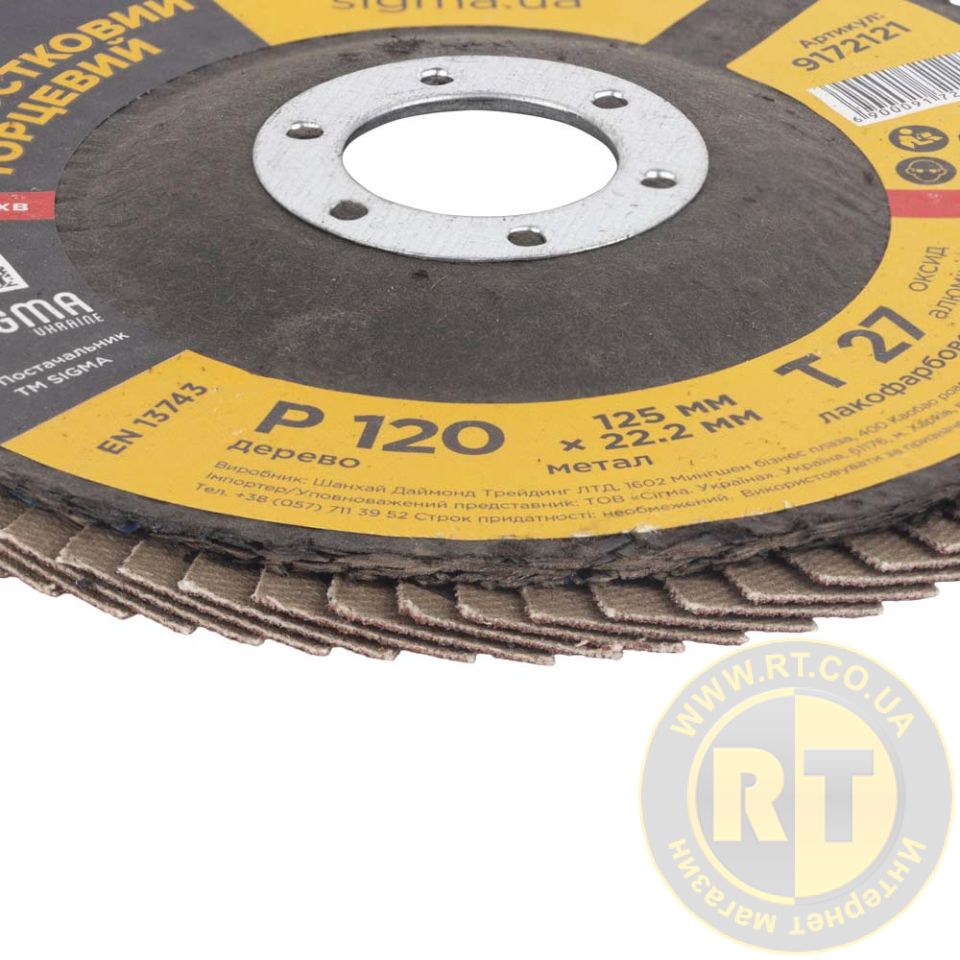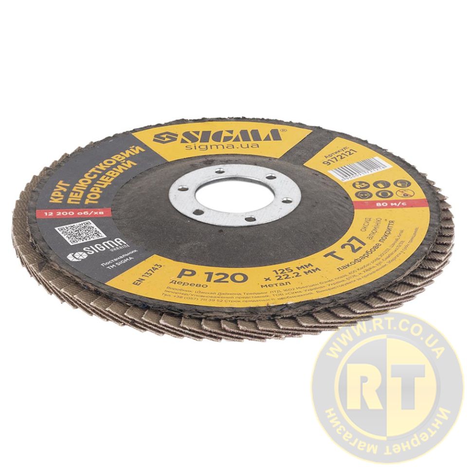 Круг лепестковый торцевой Т27 (прямой) Ø125мм P120 SIGMA (9172121) предназначен для плоского шлифования, обработки кромок сварных швов деталей и конструкций из различных марок сталей, цветных металлов и древесины.