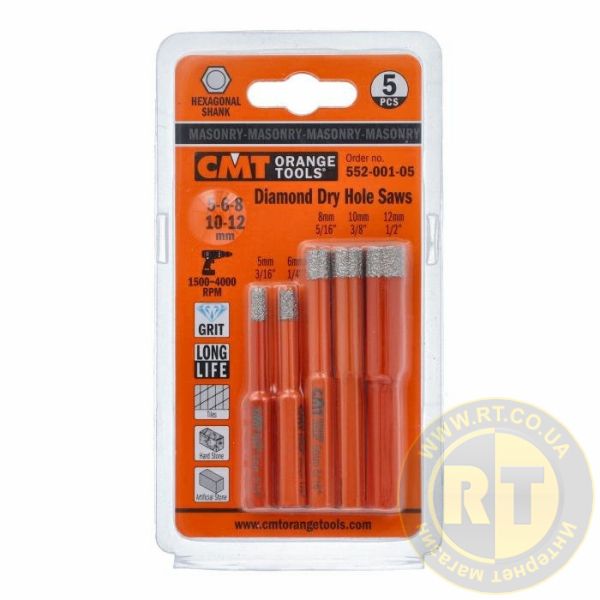 Набір з 5 алмазних коронок CMT діаметрами 5 мм, 6 мм, 8 мм, 10 мм, 12 мм для сухого свердління твердих матеріалів - керамограніту, плитки, граніту, мармуру, кварцу та штучного каменю. Гарантує чистий різ і довговічність навіть при інтенсивній роботі. Підходить для роботи з дрилем (шестигранний хвостовик).