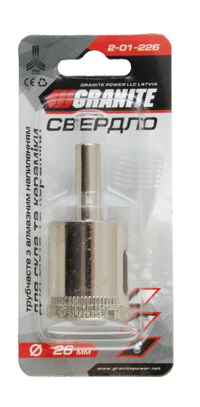 Рабочая часть имеет высококачественное алмазное напыление, которое обеспечивает чистый срез и длительный ресурс использования. Трубчатая конструкция способствует удалению пыли и охлаждению зоны резания. Подходит для работы со стеклом, зеркалами, керамической плиткой, фарфором, мрамором и гранитом.