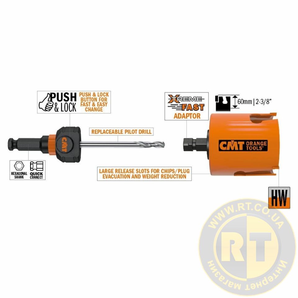 Універсальна коронка CMT 152 мм без хвостовика, з твердосплавними зубами (HW). Ідеально підходять для дерева, фанери, МДФ, цегли, газобетону та пластику. Швидка заміна PUSH & LOCK та ефективне видалення відходів.