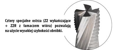 Спеціальна конструкція з чотирма спіралями (Z2 чистові + Z2R з подрібнювачем тирси) дозволить швидко обробляти та залишати чистий різ на заготовці.