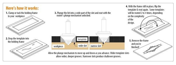 Благодаря запатентованной системе 3D Router Carver любой, у кого есть погружной фрезер, может создавать красивые проекты за считанные минуты. Украсьте двери, ящики, шкафы, мебель или любую плоскую деревянную поверхность одним или несколькими из этих рисунков. Как это работает? Секрет заключается в насадке 3D Router Carver и том, как она взаимодействует с шаблонами для резьбы. Фреза V-образной канавки заключена в конусообразную направляющую под углом 45°. Вы выполняете фрезерование с разблокированным механизмом погружения фрезы, позволяя фрезе перемещаться вверх или вниз по мере движения фрезы вперед. По мере того, как прорезь в шаблоне становится шире, сверло перемещается вниз, образуя более широкую и глубокую V-образную канавку. По мере того, как прорезь становится уже, сверло перемещается вверх, а канавка становится уже и мельче. Звучит просто, и это так! (поэтому система запатентована во всем мире).