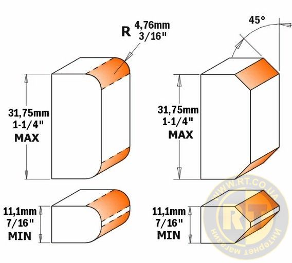 Цим типом фрез Ви можете виконати двостороннє заокруглення або зняти фаски за один прохід. Дистанційні шайби дозволяють працювати з різними за висотою матеріалами. Використовуйте тільки