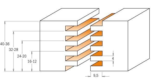 Ця фреза дозволить Вам створювати акуратні з\'єднання на прямий шип з кроком 4 мм. Наприклад, її можна використовувати для виготовлення маленьких ящиків. Завдяки розбірній конструкції її легко налаштувати на заготовки різної товщини. Використання змінних фрез значно спрощує ремонт і збільшує термін використання фрези. Глибину з\'єднання можна регулювати за допомогою підшипників. У комплекті підшипник 9,5 мм, додаткові підшипники купуються окремо - 4,75; 6,35; 8; 14,3 мм. Фреза призначена для використання на фрезерному столі. Увага! Не використовуйте цю фрезу для зрощування заготовок. Використовуйте для цих цілей фрезу серії 8 / 900.606.