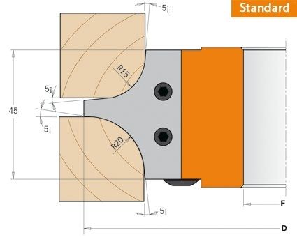 Стандартна фреза комплектується ножами радіусами 5 i 20мм; є можливість придбати ножі з радіусом 12-18мм. Для використання на фрезерних та форматних верстатах.