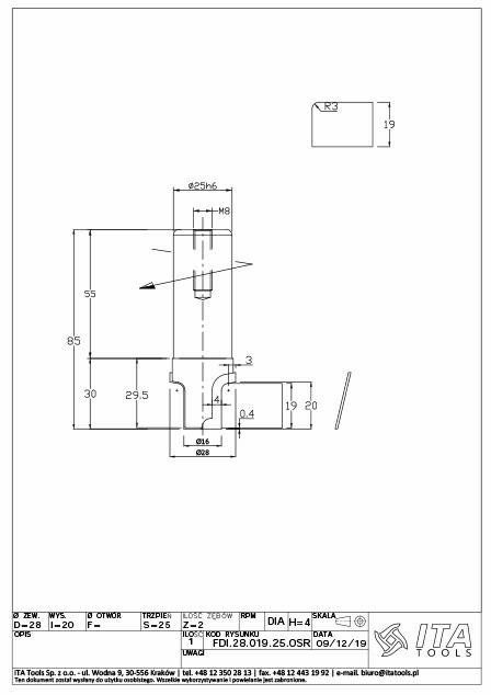 FDI.Фреза D=28/16 I=19,4 S=25x50 L=85 Z=2+1 H=4,0 R3 RH / засвердлення ITA TOOLS FDI.28.019.25.0SR