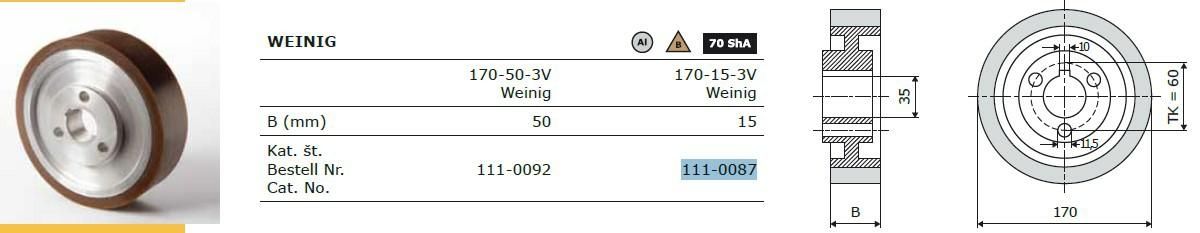 Ролик резиновий D=170 F=35 I=15 3 отвори Tk=60 мм корпус ALU 70 ShA WEINIG ELASTOMERI WEG.170035015.VBA