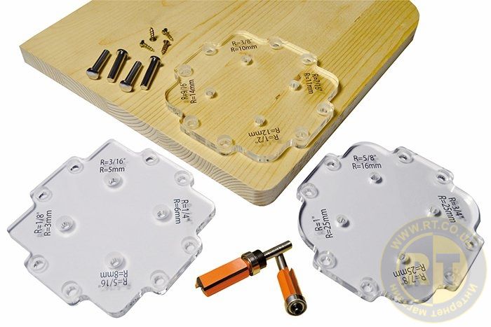 Набір складається з 3-х акрилових шаблонів товщиною 8 мм, завдяки яким Ви зможете створити до 12 різних радіусів (4 на кожному шаблоні), застосовуючи прямі фрези з верхнім або нижнім підшипником (немає в комплекті). У комплект входять 4 дюбелі за допомогою яких кріпиться шаблон до матеріалу і 4 гвинти для деревини. Після видалення штифтів, ви можете перейти до роботи, використовуючи наші фрези та шаблони для заокруглень, для отримання потрібного радіусу на заготовці. Три шаблони (12 різних радіусів) 3 5 6 8 10 11 12 14 16 19 22 25