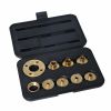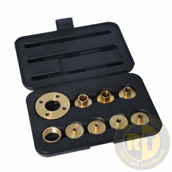Набір CMT-TGA - комплект з семи латунних копіювальних кілець(втулок) і приладдя для установки копіювальних кілець на ручні фрезери. Цей практичний набір копіювальних кілець може істотно розширити можливості майстра при фрезеруванні по шаблонах, наприклад, пазів, посадочних місць під петлі і замки, виготовленні сходів та ін. Ці копіювальні кільця підходять для більшості популярних ручних фрезерів з отвором в базі O30 мм (1-3- / 16 "). Для використання на деяких ручних фрезерах додатково потрібно фрезерна база CMT арт. 899.000.01 або арт. 899.000.02.
