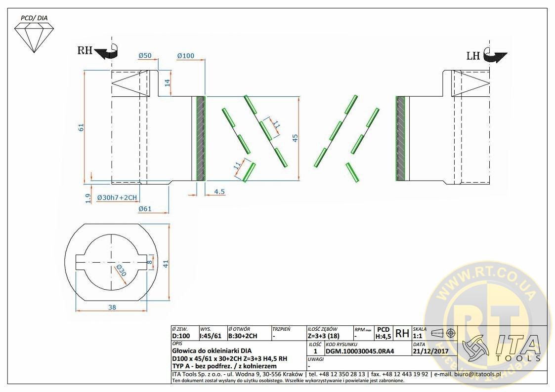DGM.Фреза насадна D=100 I=45/61 d=30+2CH Z=3+3 (18) H4,5 RH TYP A ITA TOOLS DGM.100030045.0RA4