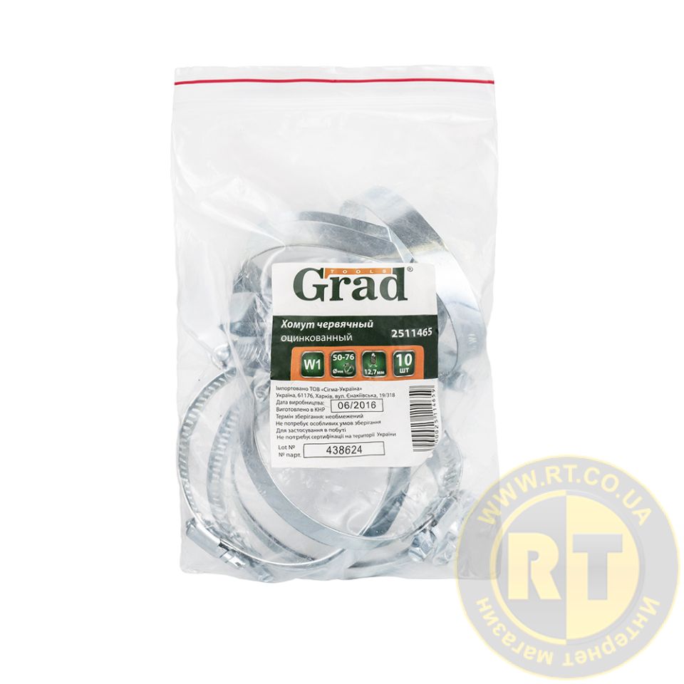 Хомут червячный оцинкованный 12.7мм D50-76мм 10шт GRAD 2511465