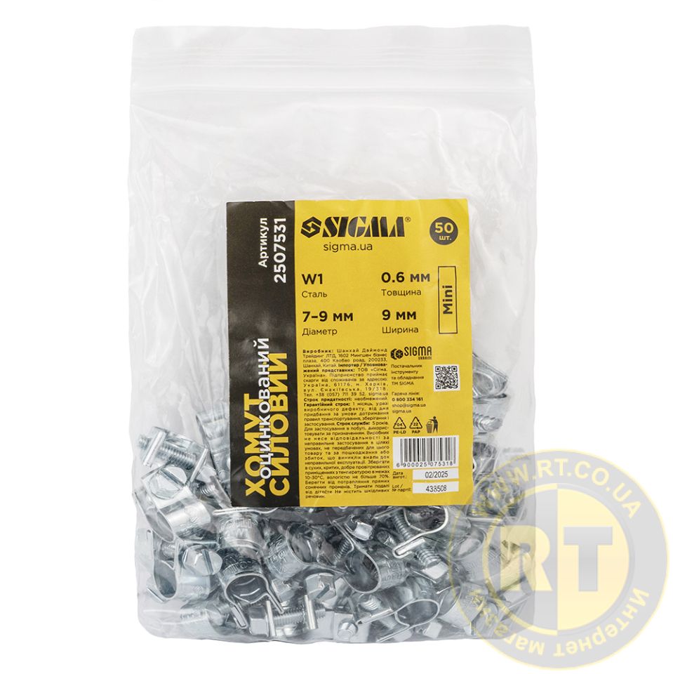 Хомут силовой оцинкованный Mini 9мм Ø7-9мм 50шт SIGMA 2507531