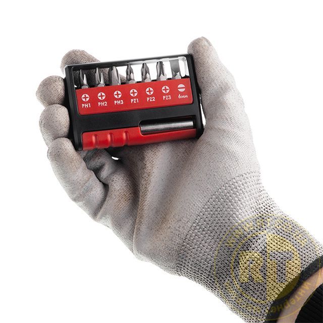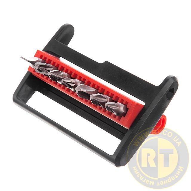 Набор бит с держателем укомплектованы в удобный пластиковый кейс. Комплект удобно хранить и транспортировать, складывается в компактный коробок. Каждая бита имеет маркировку на кейсе для быстрого поиска нужной насадки.