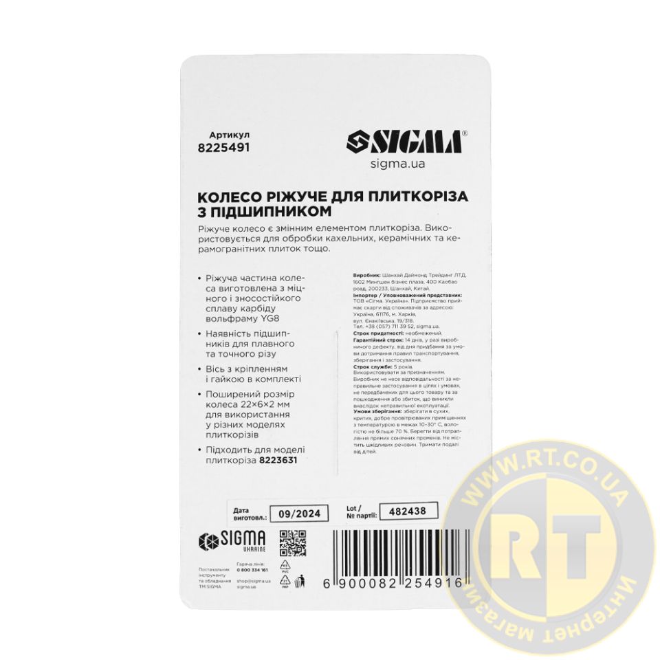 Колесо режущее для плиткореза 22×6×2мм с подшипником SIGMA (8225491)