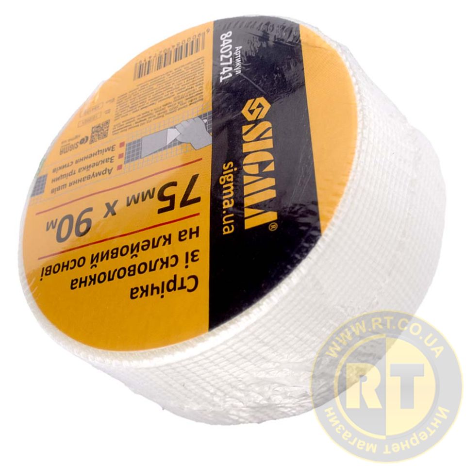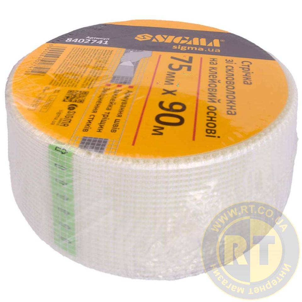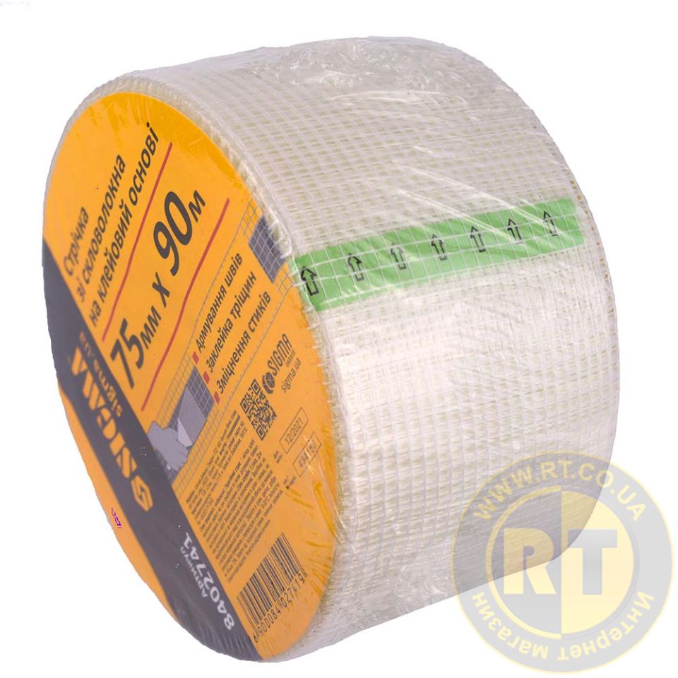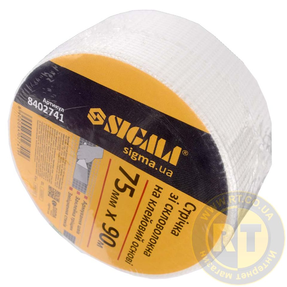 Лента стеклотканевая на клеевой основе 75мм×90м SIGMA (8402741) используется для предотвращения образования трещин и упрочнения поверхностей.