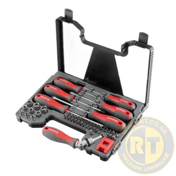 Весь набор размещен в компактном кейсе (300*200*50 мм), где реверсивная отвертка с карданом выступает в роли ручки. Это позволяет экономить пространство при хранении, а также удобно переносить комплект. Комплектующие всегда остаются на своих местах и не выпадают при транспортировке - набор закрывается на две защелки.