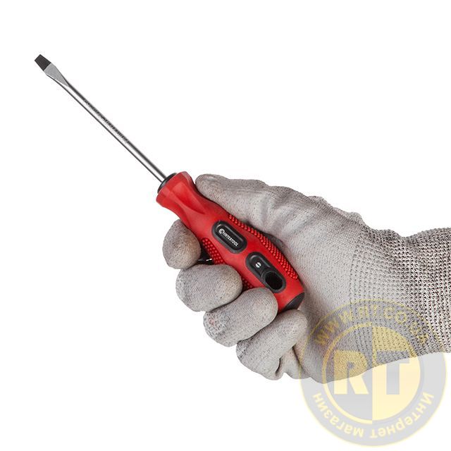 Стержень отвертки изготовлен из прочной Cr-V стали, которая известна всем мастерам своей надежностью и выносливостью. В составе этой стали присутствуют хром и ванадий, которые придают изделию высокую стойкость к износу. Также сталь отличается долговечностью и не подвержена хрупкому разрушению. Стержень глубоко посажен в рукоятку и крепиться в двух местах, что исключает возможность срыва.