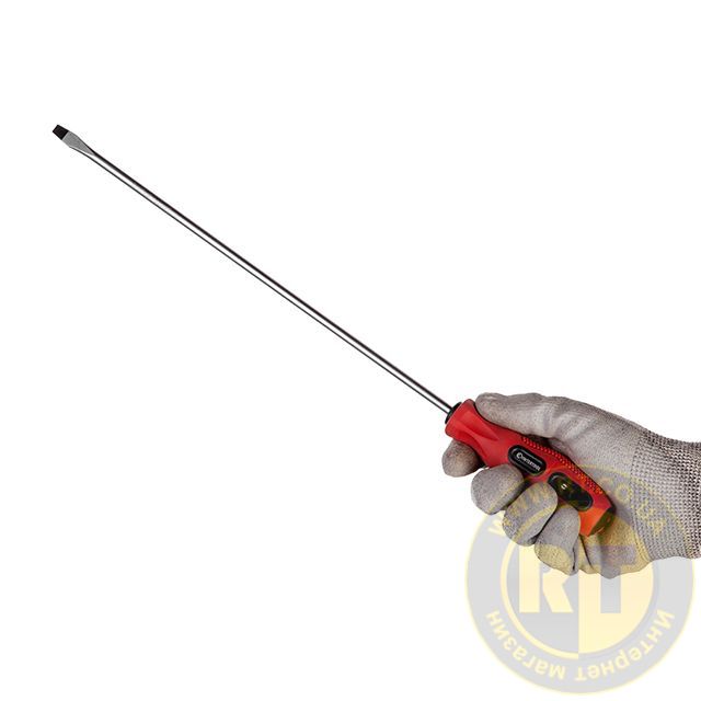 Стержень отвертки изготовлен из прочной Cr-V стали, которая известна всем мастерам своей надежностью и выносливостью. В составе этой стали присутствуют хром и ванадий, которые придают изделию высокую стойкость к износу. Также сталь отличается долговечностью и не подвержена хрупкому разрушению. Стержень глубоко посажен в рукоятку и крепиться в двух местах, что исключает возможность срыва.