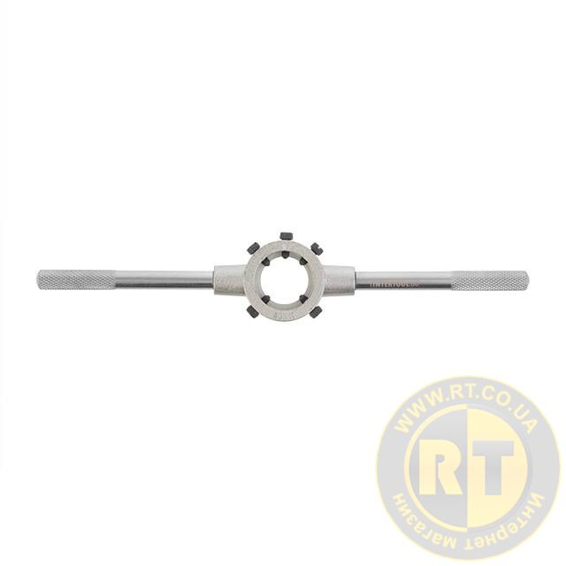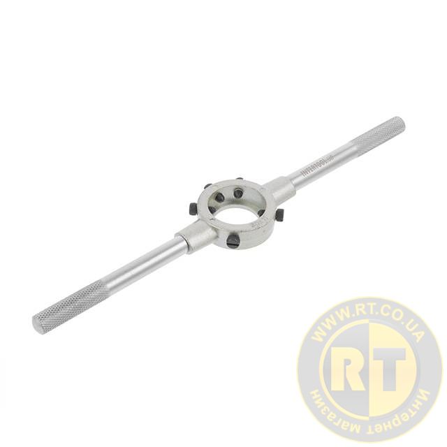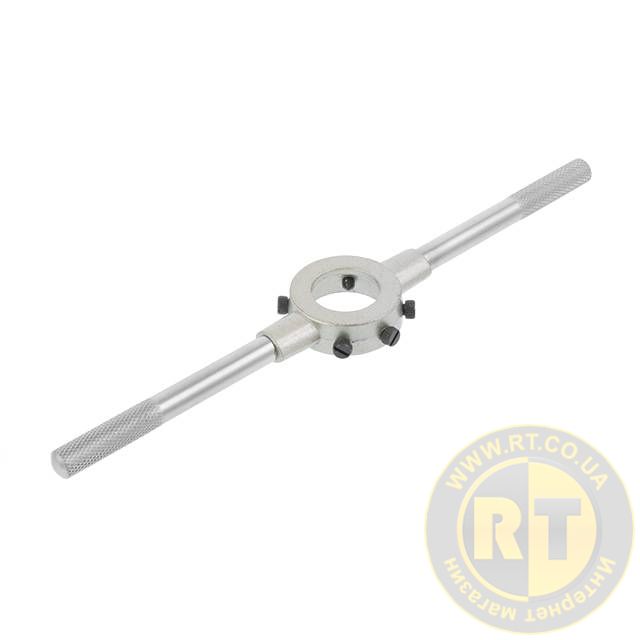 Держатель достаточно простой конструкции с хромированным покрытием. Размер под плашку регулируется с помощью винтов, они также плотно фиксируют плашку против проскальзывания, что обеспечивает точно нарезанную резьбу, без перекосов. Ручки держателя с насечками для удобной работы против проскальзывания.