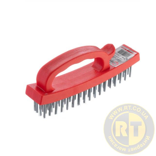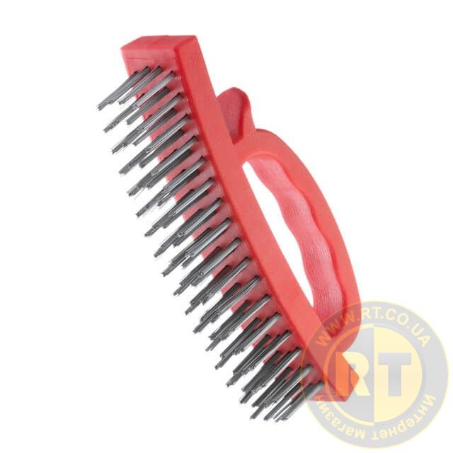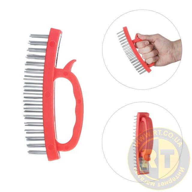 Щетка изготовлена из стальной высококачественной проволоки, размещенной в несколько рядов. Ручка выполнена из пластика, ее удобно держать и управлять процессом зачистки. Упор под большой палец в конструкции ручки обеспечивает удобство и лучший контроль над рабочим процессом.