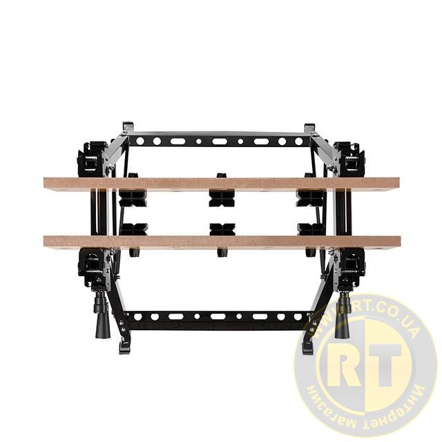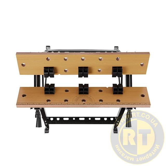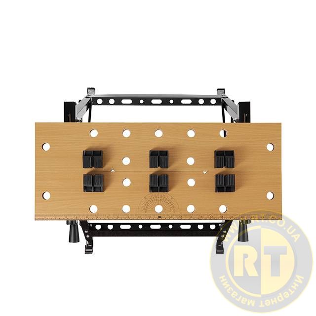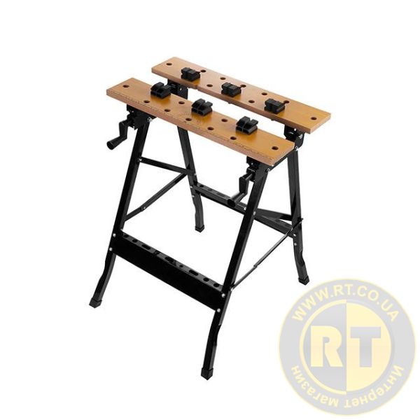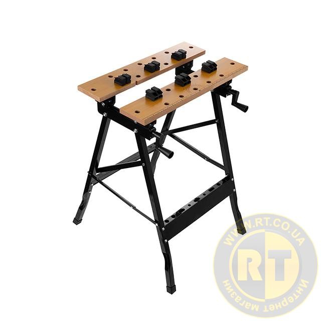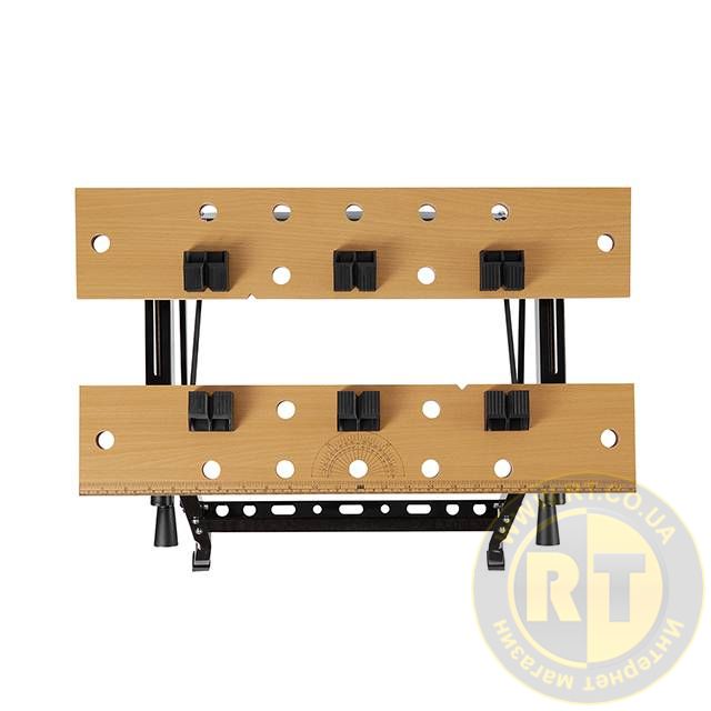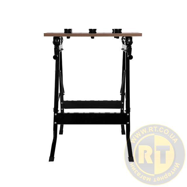 Изготовлен верстак из качественной стального профиля со столешницей из ДСП, габаритами 605*240*790 мм и выдерживает равномерную нагрузку до 100 кг. С помощью металлических раздвижных планок верстак компактно складывается для последующего хранения и транспортировки.