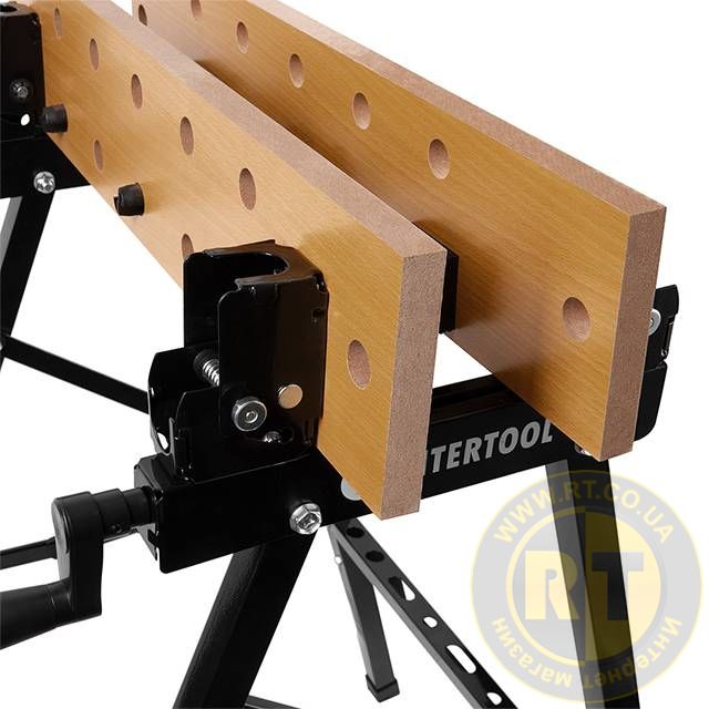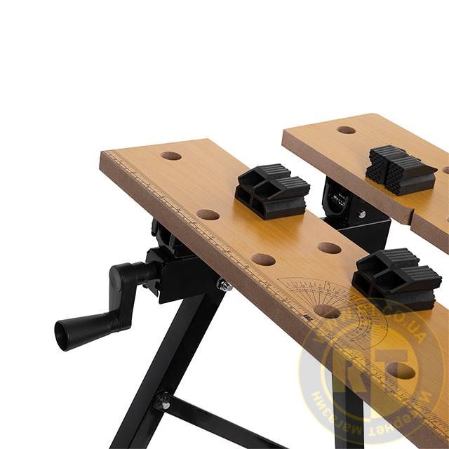 Благодаря удобным ручкам тиски можно открыть и зафиксировать необходимый предмет, шириной до 27 см. Отверстия в столешнице, а также съемные пластиковые упоры служат для прижима и фиксации заготовок.
