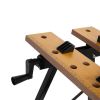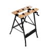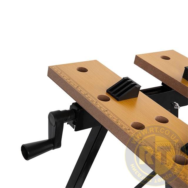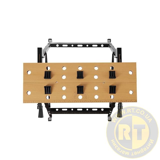 Столешница верстака выступает в роли тисков и может использоваться для фиксации различных по размерам деталей. Благодаря двум удобным ручкам тиски можно открыть и зафиксировать необходимый предмет, шириной до 27 см. Отверстия в столешнице, а также съемные пластиковые упоры служат для прижима и фиксации заготовок.