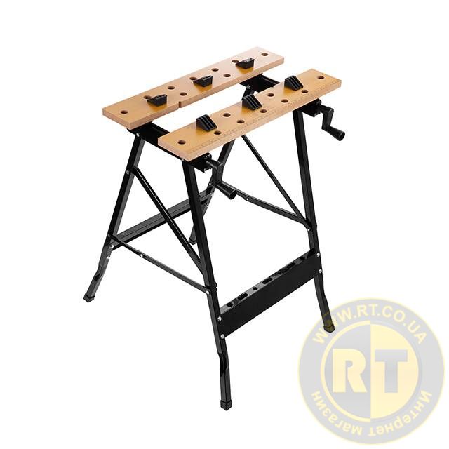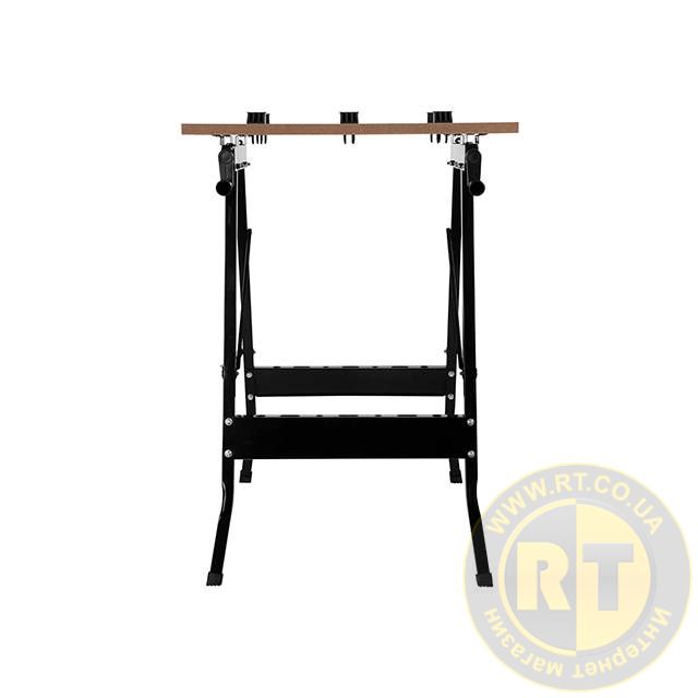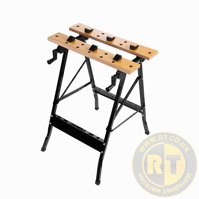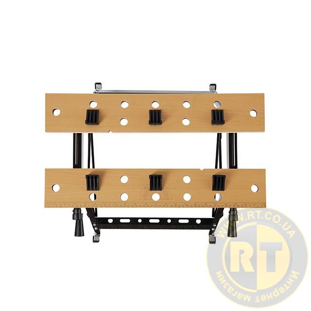 Изготовлен верстак из качественной стального профиля со столешницей из ДСП, габаритами 565*200*760 мм и выдерживает равномерную нагрузку до 100 кг. С помощью металлических раздвижных планок верстак компактно складывается для последующего хранения и транспортировки.