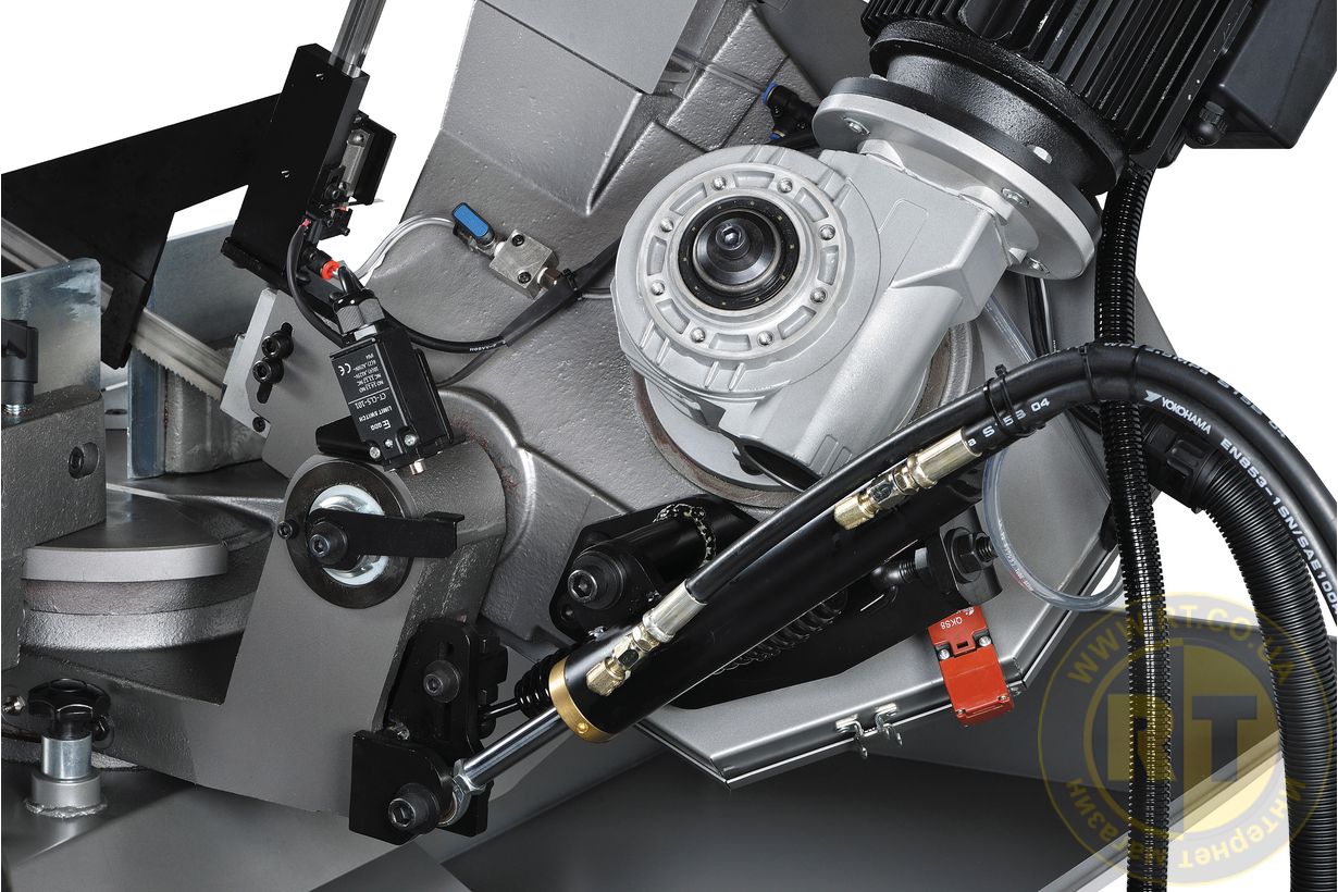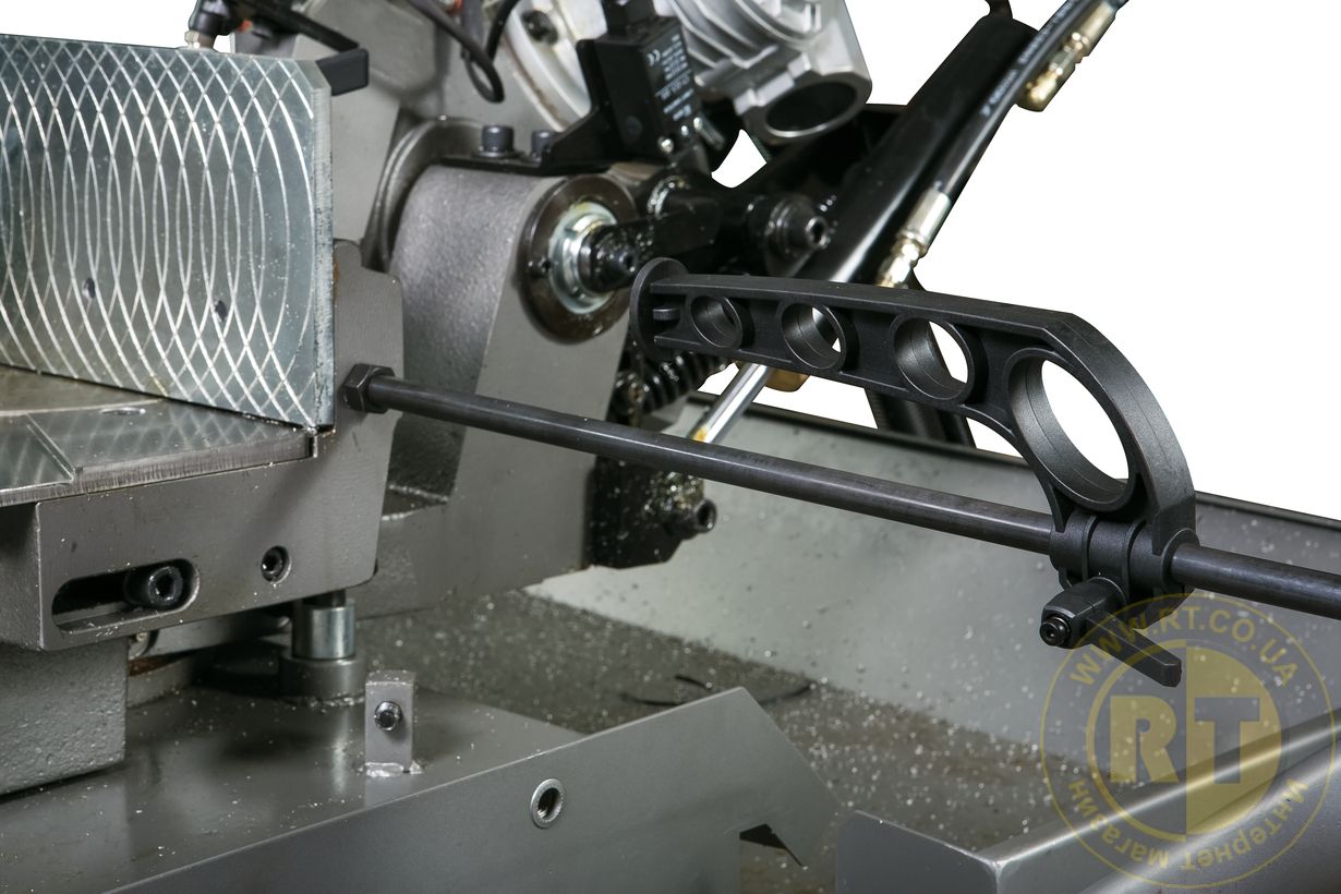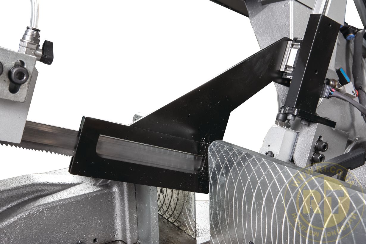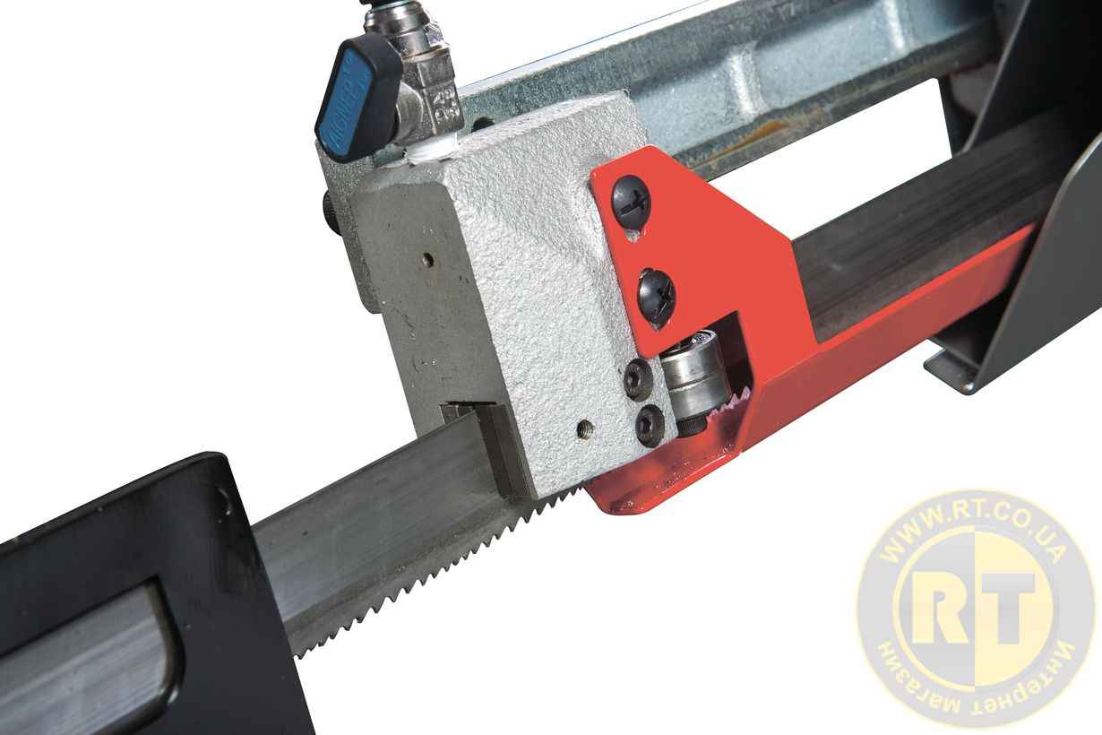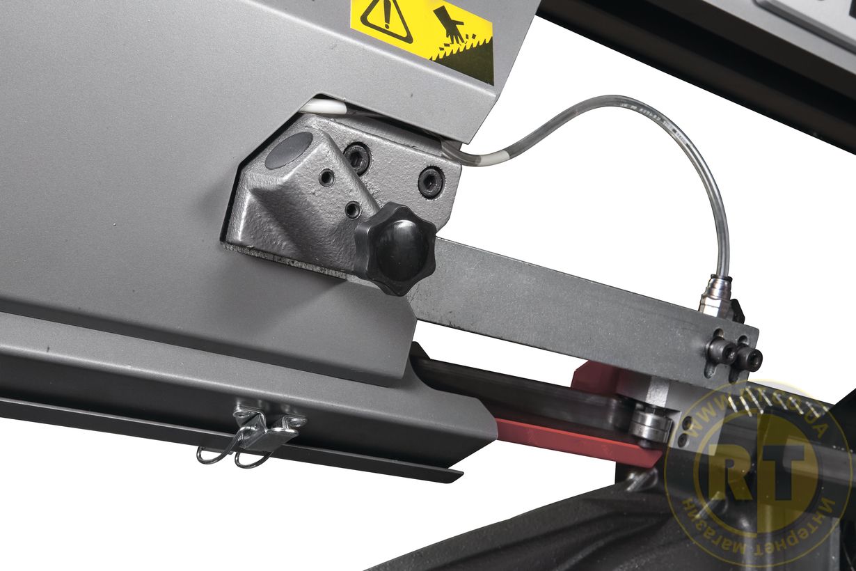 Ленточнопильный станок оборудован быстрозажимными тисками, используя которые можно добиться высокой производительности работ. Консоль станка имеет направляющие, передвижение которых позволяет регулировать проход ленточного полотна, повысить качество распила и ограничить ввод полотна в сторону. Направляющие оснащены подшипниками, выполняющими функцию позиционирования ленточного полотна в вертикальном положении относительно обрабатываемой заготовки. Станок имеет тензометр, фиксирующий силу натяжения ленточного полотна. Регулировка силы натяжения осуществляется вручную.