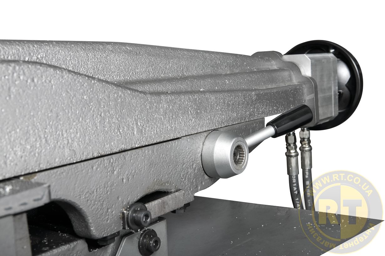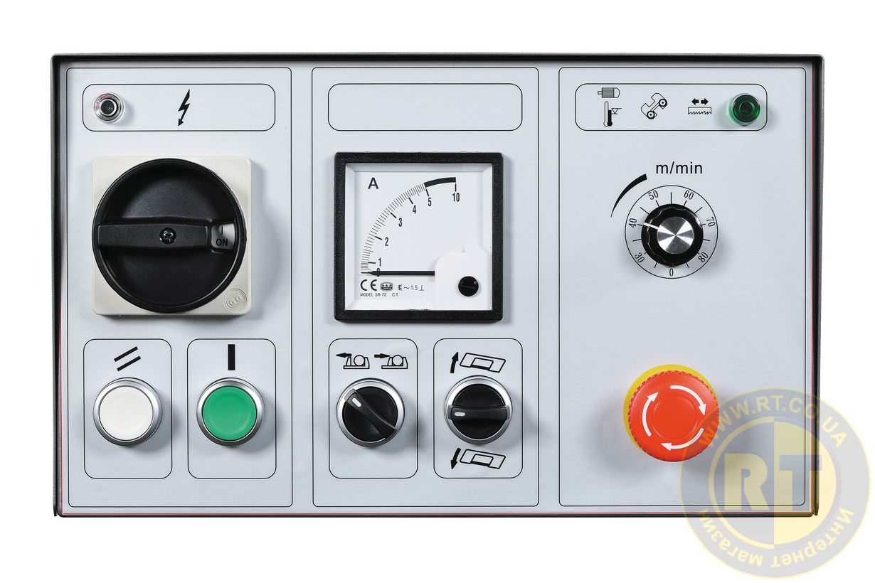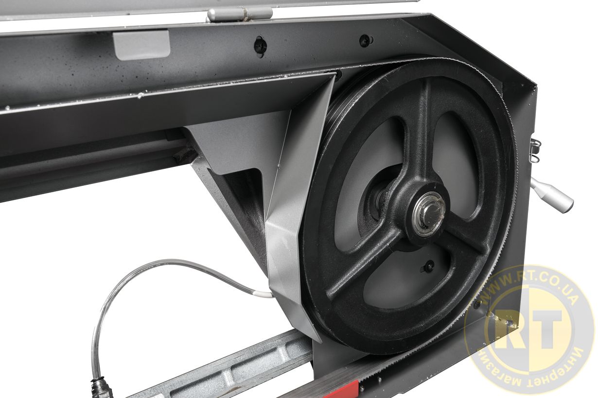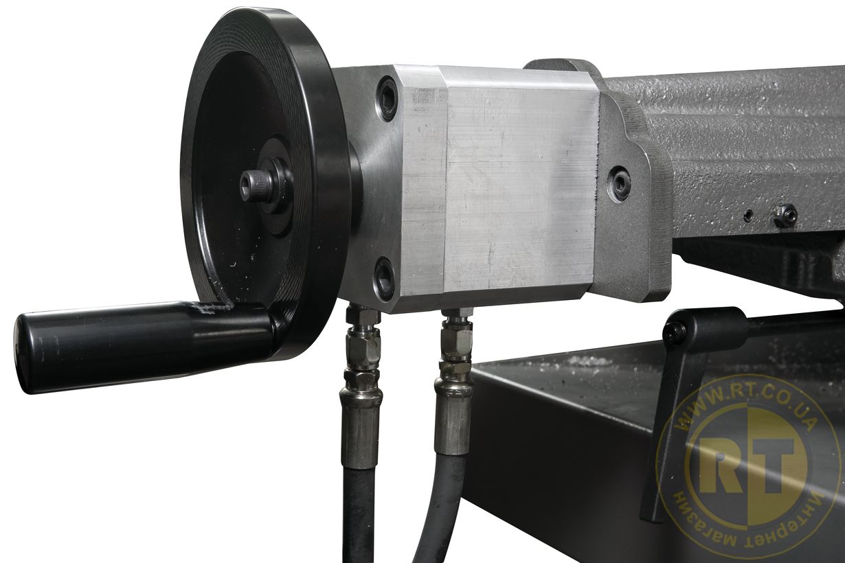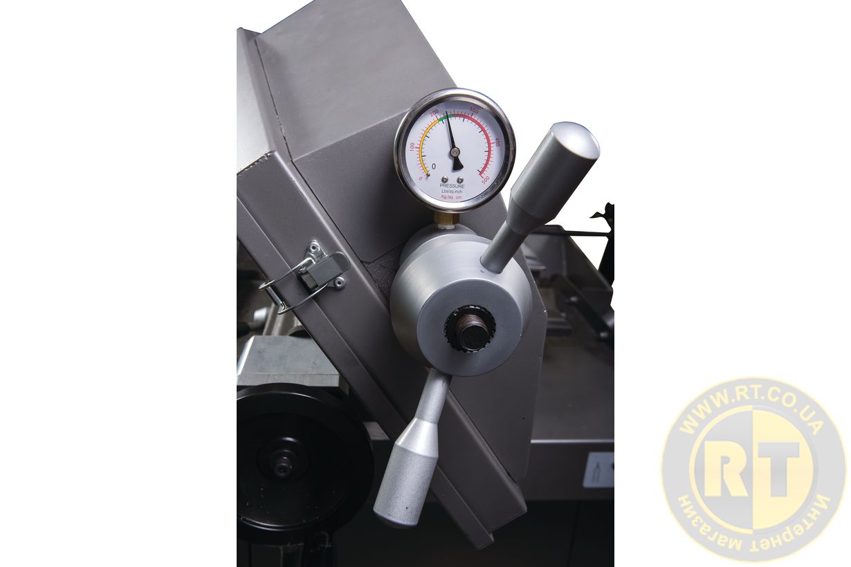 Ленточнопильный станок оборудован быстрозажимными тисками, используя которые можно добиться высокой производительности работ. Консоль станка имеет направляющие, передвижение которых позволяет регулировать проход ленточного полотна, повысить качество распила и ограничить ввод полотна в сторону. Направляющие оснащены подшипниками, выполняющими функцию позиционирования ленточного полотна в вертикальном положении относительно обрабатываемой заготовки. Станок имеет тензометр, фиксирующий силу натяжения ленточного полотна. Регулировка силы натяжения осуществляется вручную.
