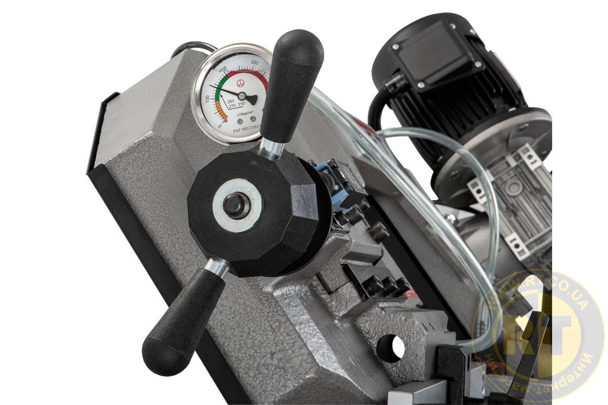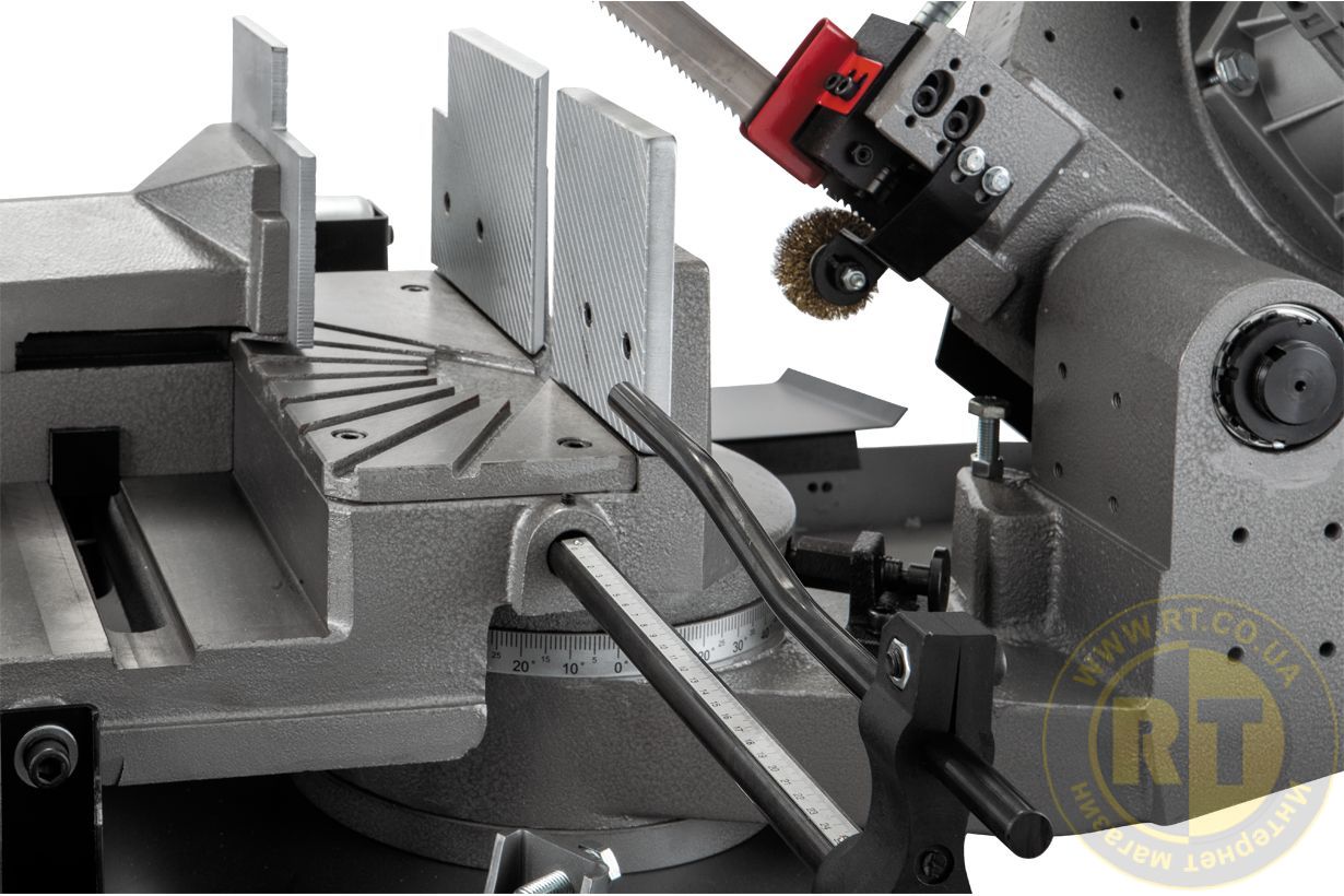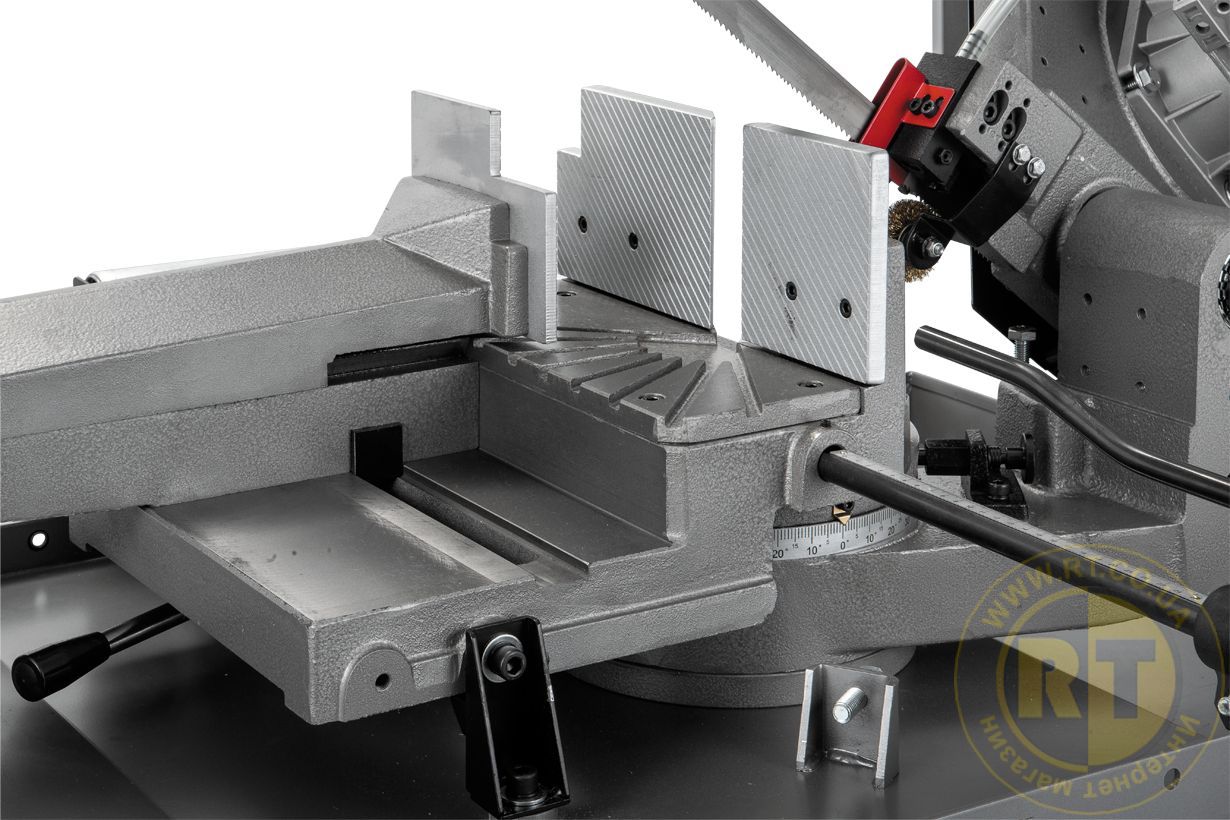 - Гидравлические тиски с широкими рифлеными губками для быстрого и надежного зажима заготовки. Давление легко перемещается параллельно к заготовке и дает возможность пилить под разными углами.
