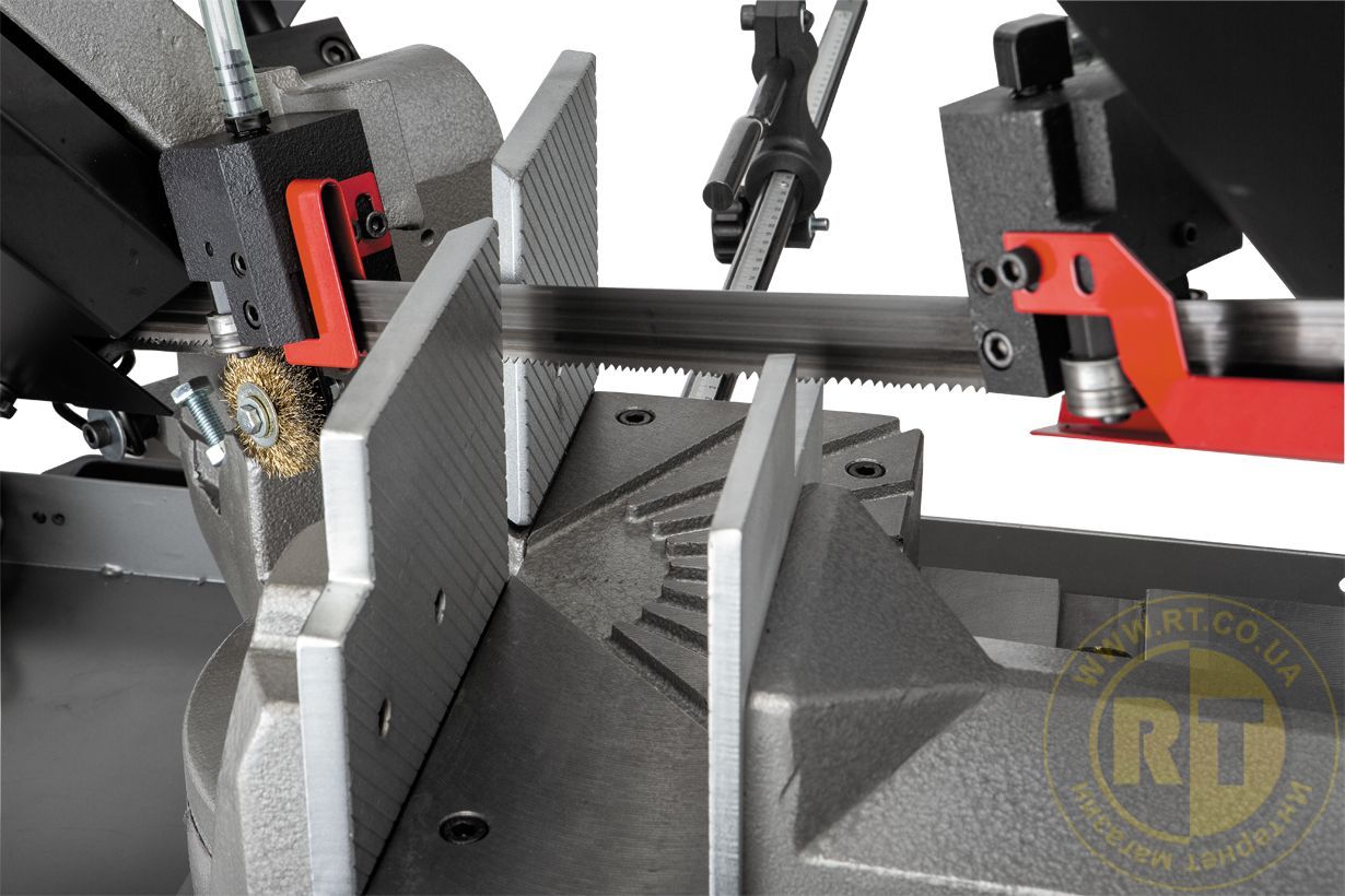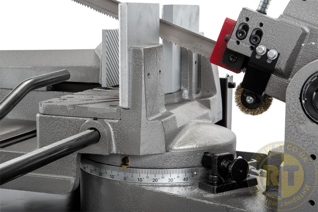 Станок имеет 2-х точечную систему подачи СОЖ через направляющие блоки, что значительно улучшает эксплуатационные характеристики ленточного полотна. Установленная кордщетка гарантирует очистку полотна от большой стружки, которую не вымоет СОЖ. Модель оборудована удобной тумбой-подставкой со съемным поддоном, для сбора стружки и охлаждающей отработанной жидкости. Вес станка 396 кг.
