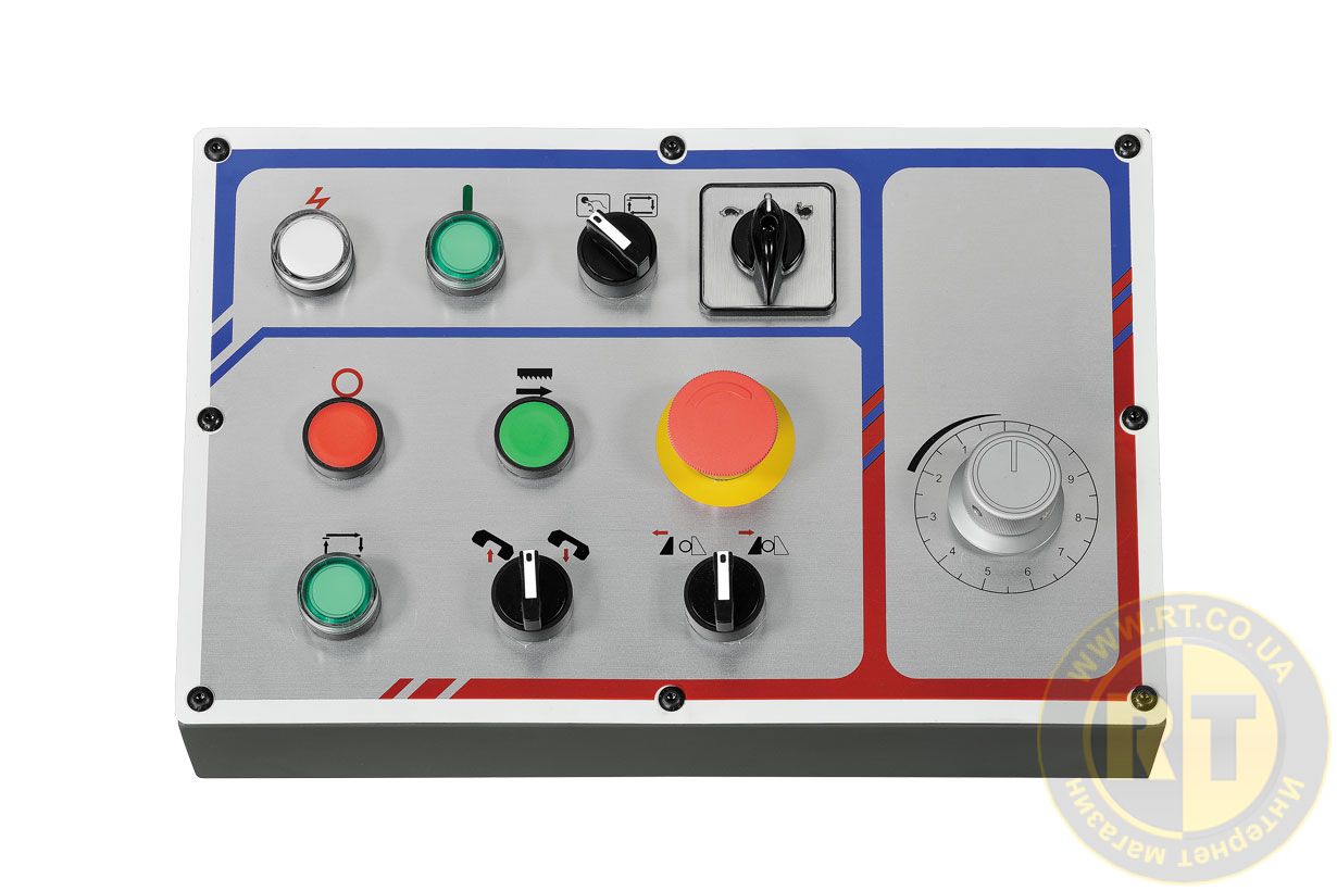 Управление станком осуществляется через центральную панель управления. Сила натяжения ленточного полотна устанавливается вручную и определяется показаниями тензометра. Для экстренной остановки станка предусмотрена кнопка аварийного выключения и датчик обрыва полотна.