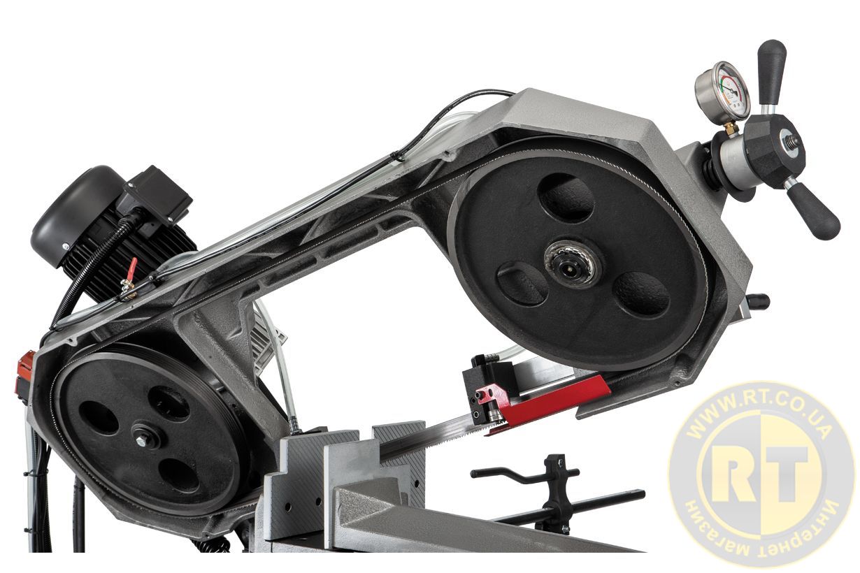 Ленточнопильный станок оборудован гидравлическими тисками с широкими рифлеными губками для быстрого и надежного зажима заготовки. Давление легко перемещается параллельно к заготовке и дает возможность пилить под разными углами. Дополнительно установлена входная роликовая опора для облегчения установки и перемещения тяжелых деталей. Регулируемый конечный упор с легко читаемой линейкой используется при проведении серийных работ.