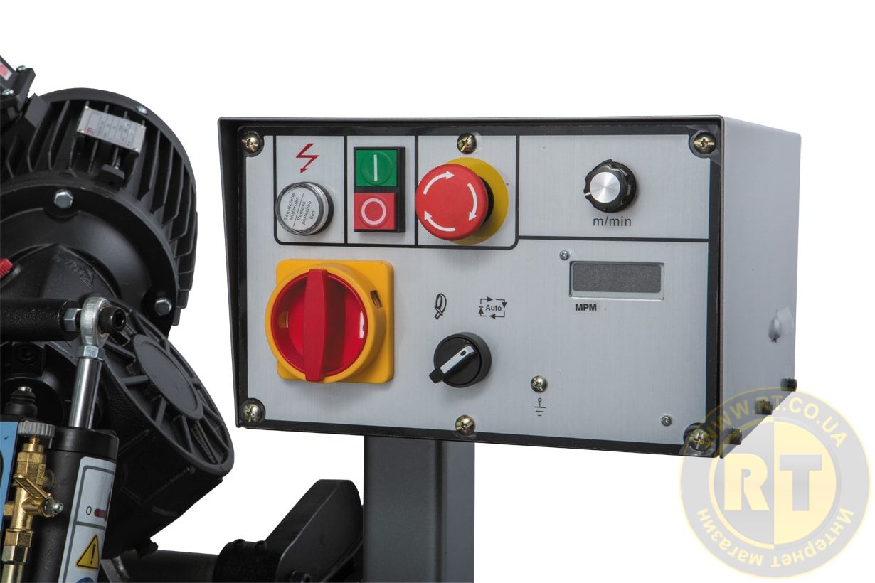 Моторная группа станка MBS-1013CSD оснащена мощным экономичным электродвигателем – 1,5 кВт, работающим в разных режимах. Плавная регулировка скорости движения ленточного полотна достигается благодаря частотному преобразователю. Станок обеспечивает скорость движения ленточного полотна в диапазоне 26-85 м/мин в зависимости от материала обрабатываемой заготовки и диаметра. Скорость движения холста освещается на дисплее. Управление процессом осуществляется с пульта управления, расположенного рядом с моторным кожухом. Станок оснащен кнопкой экстренной остановки. Качество распила, безопасность работы обеспечивается представлением СОЖ непосредственно в зону резки.