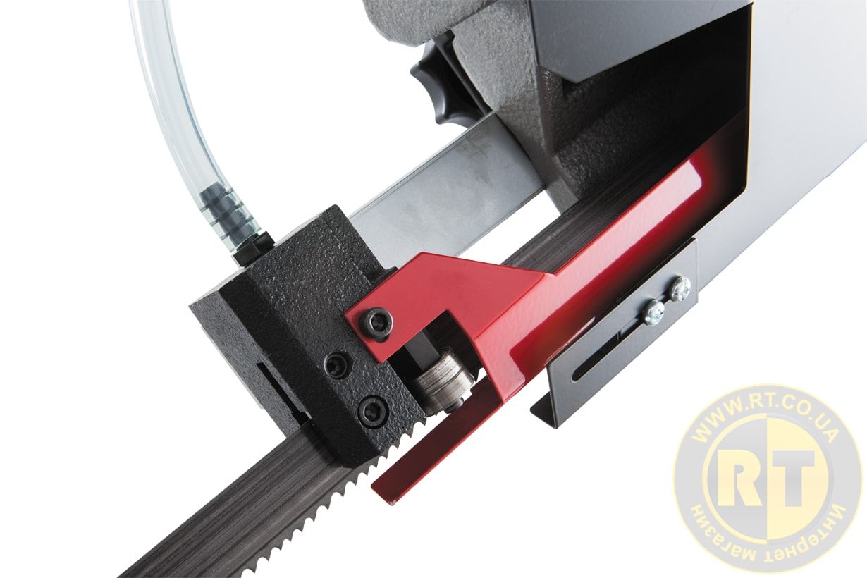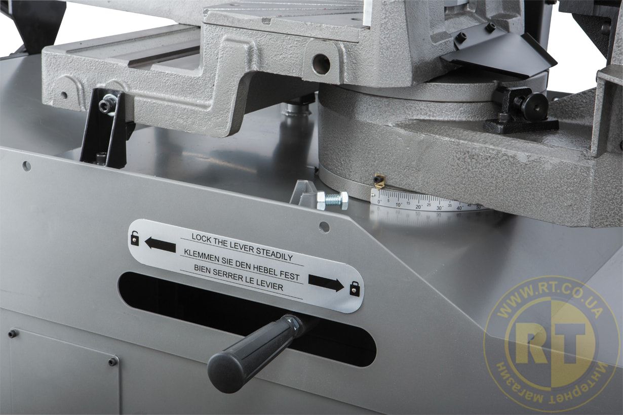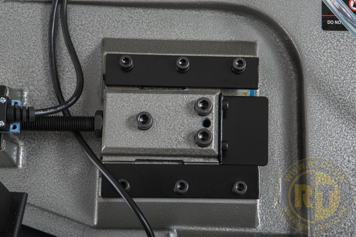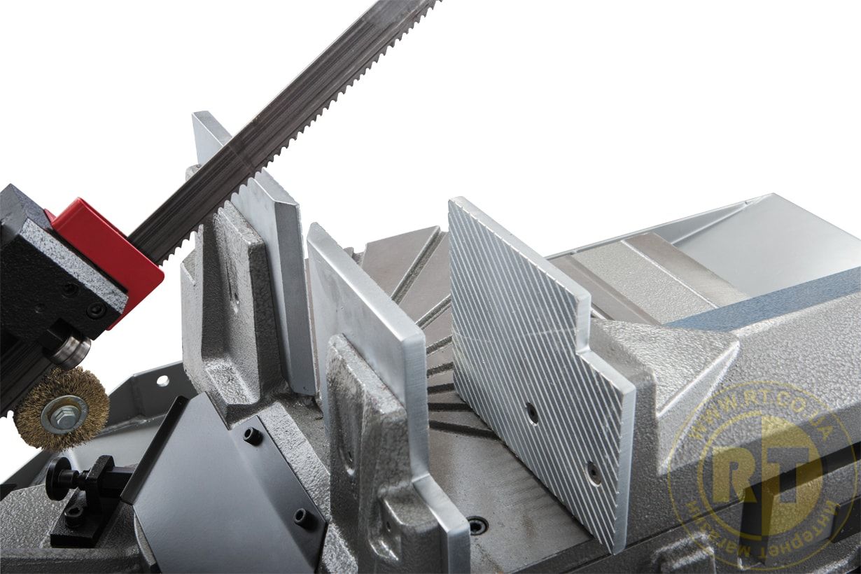 Модель станка оборудована быстрозажимными тисками, благодаря которым повышается производительность работ. Давление может передвигаться перпендикулярно движению ленточного полотна для обработки заготовок под разными углами.