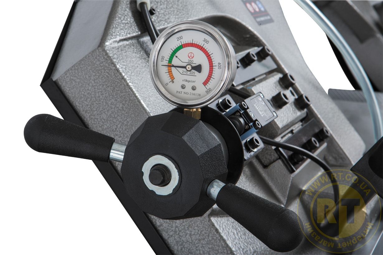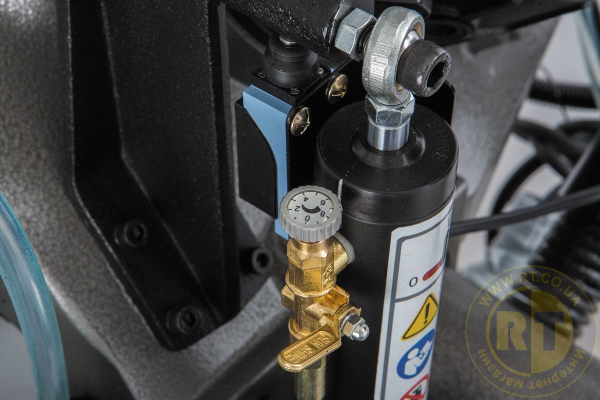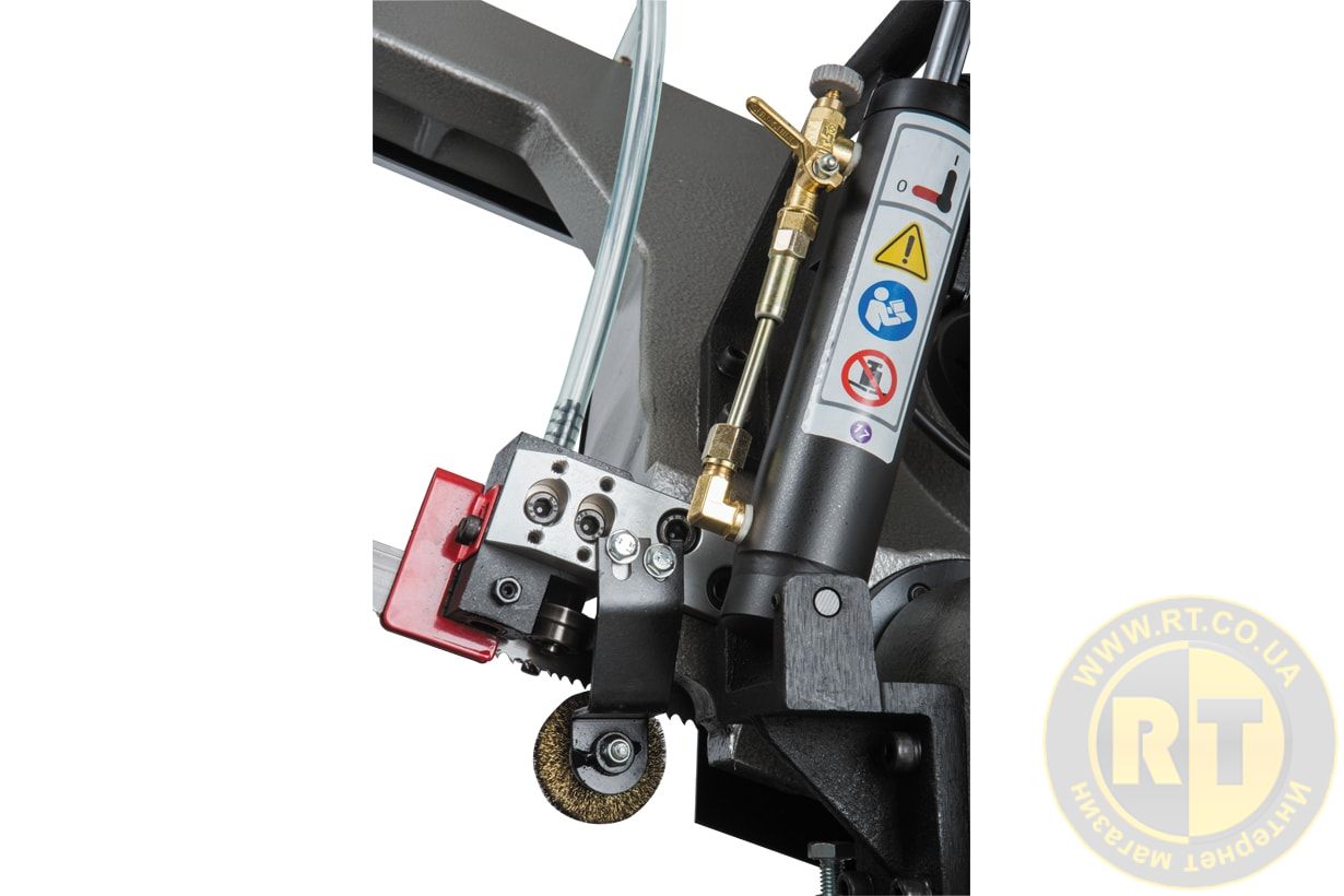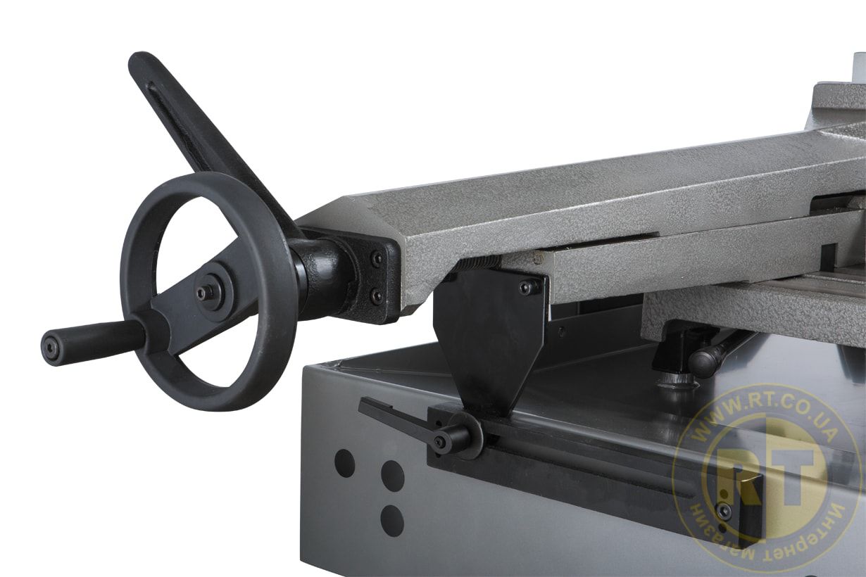Модель станка оборудована быстрозажимными тисками, благодаря которым повышается производительность работ. Давление может передвигаться перпендикулярно движению ленточного полотна для обработки заготовок под разными углами.