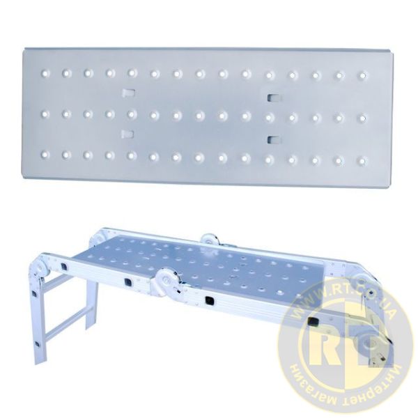 Изготовлена из высококачественной стали, имеет стойкое покрытие и перфорированную нескользящую поверхность, выдерживает любые нагрузки до 150 кг. Обеспечивает более безопасное и удобное использование лестницы трансформера.