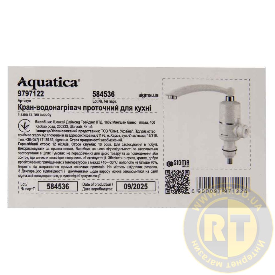 Кран-водонагреватель проточный NZ 3.0кВт 0.4-5бар для кухни гусак прямой на гайке AQUATICA NZ-6B212W 9797122