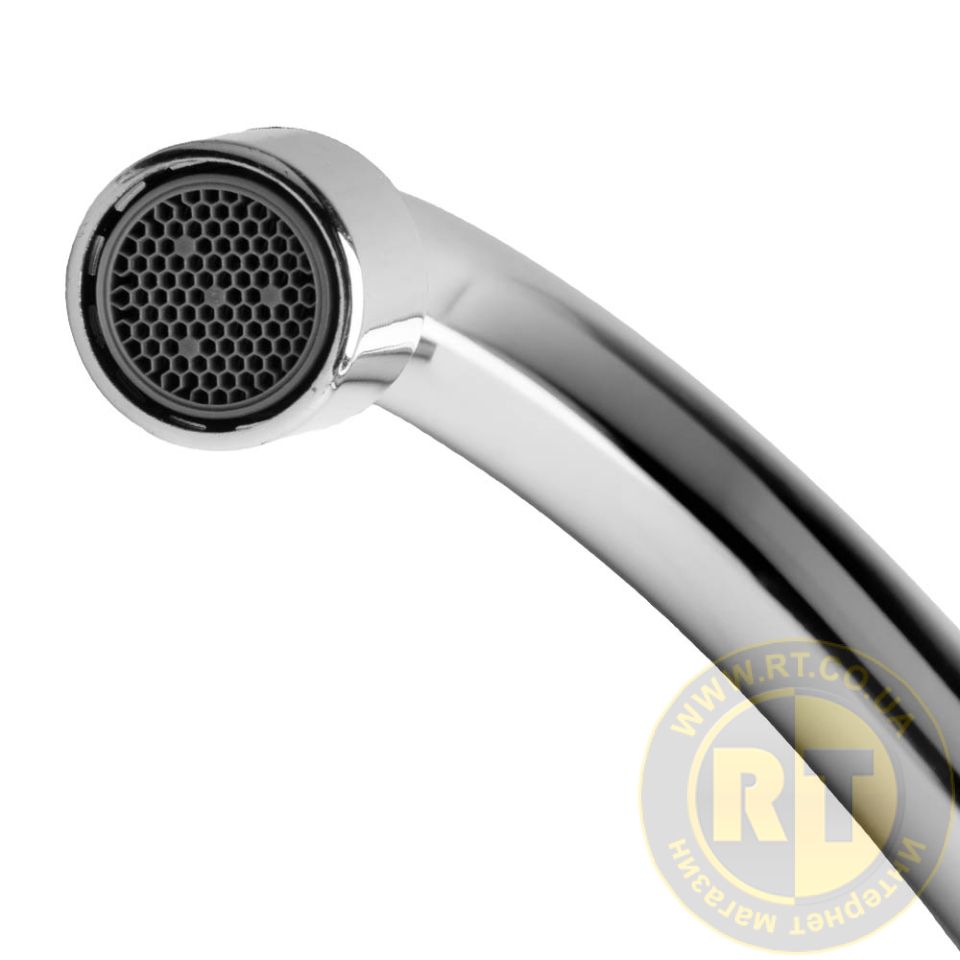 Излив для смесителей раковины, в данном случае, имеет J-образную форму и вращается на 360°, что очень удобно при мытье посуды или предметов обихода.