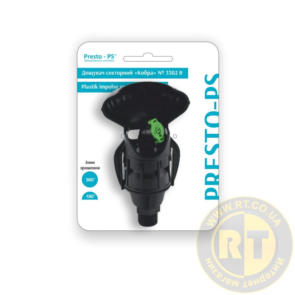 Дощувач Presto-PS Кобра (3302 B) використовується для зрошення газонів середньої та невеликої площі, підійде так само і для поливу городу. Має низьку витрату води і невисокий робочий тиск. Ці зрошувачі подають воду тонким струменем, імітуючи природний дощ, мають два режими роботи і обробляють по ширині сектор ділянки 180° або 360°. Максимальний діаметр покриття 18 метрів, площа поливу до 255 м?. Максимальна висота струменя досягає 2,7 метра. Оснащені вбудованим клапаном регулювання витрати води і надійним обертовим механізмом. Можливе під'єднання як до гнучкого садового шланга з установкою на ніжку або переносну триногу, так і стаціонарне встановлення на магістральну трубу за допомогою фітингів із внутрішнім різьбленням 12 мм (1/2"). Рекомендований робочий тиск у системі від 2 до 5 атмосфер. Витрата води за тиску 2 атмосфери до 0,4 м?/год. Виготовлений зрошувач з якісного ПВХ та латуні, довговічний, стійкий до впливу ультрафіолету і водорозчинних добрив.