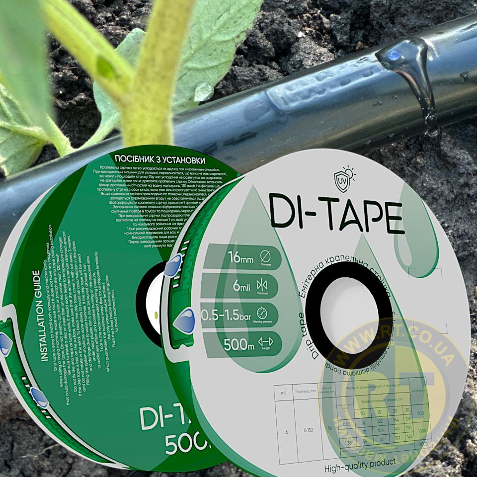 Крапельна стрічка Di-Tape (DI-10-2000) це гнучка трубка з товщиною стінки 0.15 мм (6 mil) і вбудованими крапельницями (емітерами), які розташовуються через кожні 10 см, забезпечуючи максимально сприятливі умови для вирощуваних культур. Стрічка крапельного поливу має тривалий термін служби, завдяки вбудованим крапельницями стійка до засмічення і забезпечує більш точне і більш стабільне зрошення. Для запобігання забрудненню кожна крапельниця має свій вбудований фільтр із лабіринтом у формі зубчастого каналу. Крапельниці вбудовані в стінку стрічки за допомогою екструзії і чинять мінімальний опір водяному потоку. Подвійна система захисту забезпечує максимальну надійність роботи крапельниць, за рахунок цього досягається точне, стабільне зрошення і висока однорідність поливу по всій довжині.