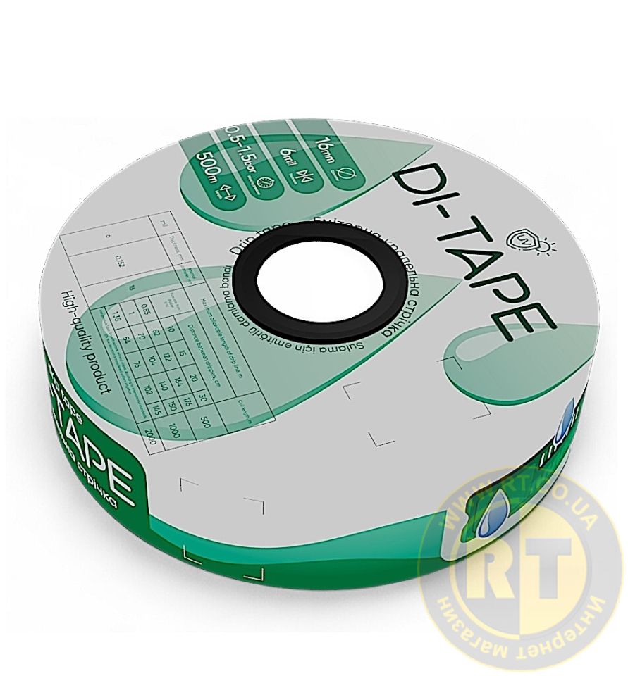 Крапельна стрічка Di-Tape (DI-15-1000) це гнучка трубка з товщиною стінки 0.15 мм (6 mil) і вбудованими крапельницями (емітерами), які розташовуються через кожні 15 см, забезпечуючи максимально сприятливі умови для вирощуваних культур. Стрічка крапельного поливу має тривалий термін служби, завдяки вбудованим крапельницями стійка до засмічення і забезпечує більш точне і більш стабільне зрошення. Для запобігання забрудненню кожна крапельниця має свій вбудований фільтр із лабіринтом у формі зубчастого каналу. Крапельниці вбудовані в стінку стрічки за допомогою екструзії і чинять мінімальний опір водяному потоку. Подвійна система захисту забезпечує максимальну надійність роботи крапельниць, за рахунок цього досягається точне, стабільне зрошення і висока однорідність поливу по всій довжині.