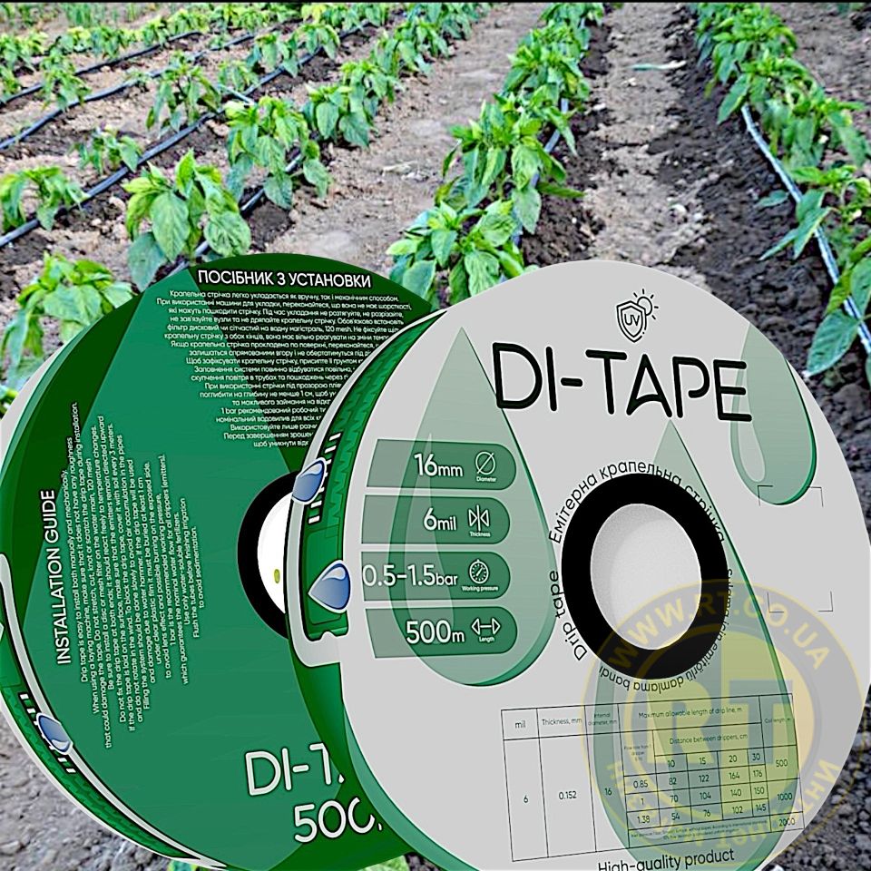 Крапельна стрічка Di-Tape (DI-20-500) це гнучка трубка з товщиною стінки 0.15 мм (6 mil) і вбудованими крапельницями (емітерами), які розташовуються через кожні 20 см, забезпечуючи максимально сприятливі умови для вирощуваних культур. Стрічка крапельного поливу має тривалий термін служби, завдяки вбудованим крапельницями стійка до засмічення і забезпечує більш точне і більш стабільне зрошення. Для запобігання забрудненню кожна крапельниця має свій вбудований фільтр із лабіринтом у формі зубчастого каналу. Крапельниці вбудовані в стінку стрічки за допомогою екструзії і чинять мінімальний опір водяному потоку. Подвійна система захисту забезпечує максимальну надійність роботи крапельниць, за рахунок цього досягається точне, стабільне зрошення і висока однорідність поливу по всій довжині.
