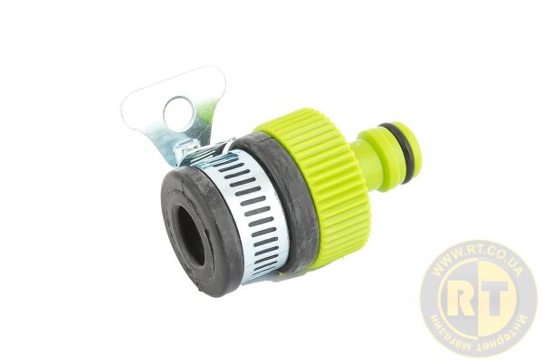 Универсальный адаптер для подключения садового шланга к крану с диаметром ½″ или ¾″. Благодаря резиновому уплотнителю и металлическому хомуту обеспечивает надежное и герметичное соединение даже на гладких или нерезьбовых носиках.