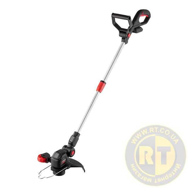 Двигун і місце для підключення акумулятора розташовані у нижній частині штанги, тому роботу важливо виконувати в суху погоду і без наявності роси. Ширина косіння становить 300 мм, використовується котушка з волосінню, діаметром 1,6 мм.