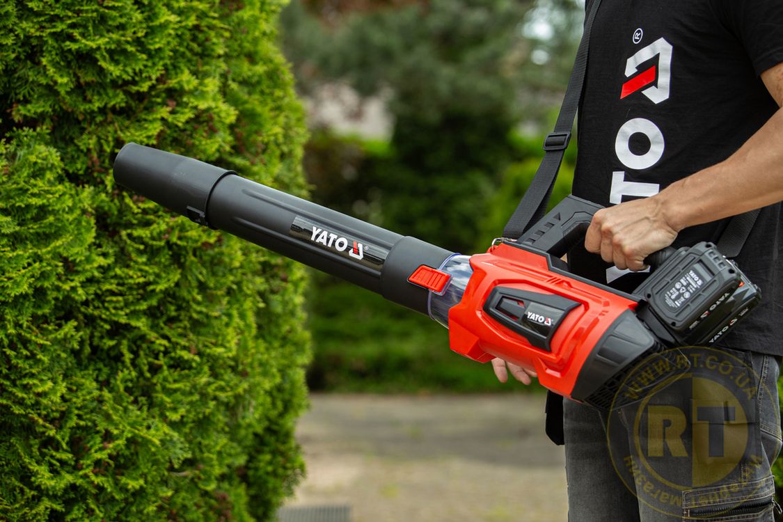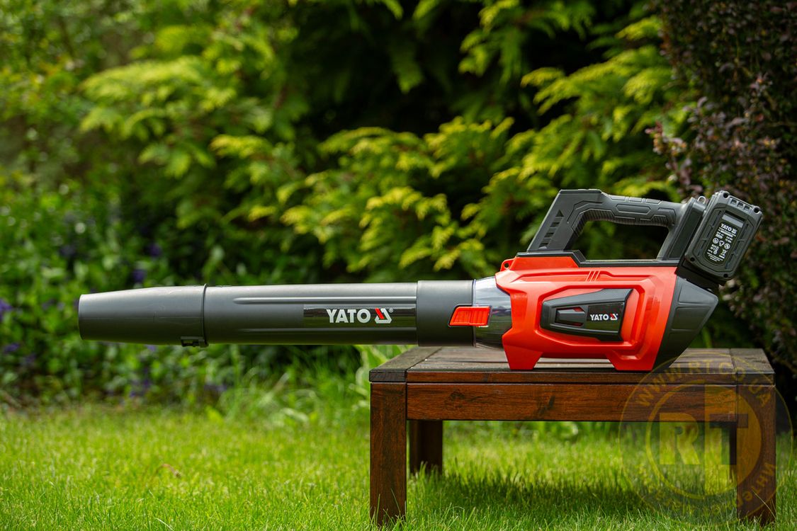 Повітродувка працює від безщіткового двигуна та двох акумуляторів YATO 18 В. Користувач може вибрати 4 швидкості роботи та імпульсну швидкість Turbo. Незамінна у садівництві – при видаленні листя з газонів та перед будинками. Також може використовуватися для будівельних робіт - сушіння основи , наприклад, перед фарбуванням смуг, сушіння країв руберойду перед зварюванням. Легке складання забезпечує зручне зберігання. Акумуляторна повітродувка працює тихіше, ніж повітродувка з внутрішнім згорянням, набагато простіше у використанні та легше . Ремінець дозволяє носити повітродувку на плечі.